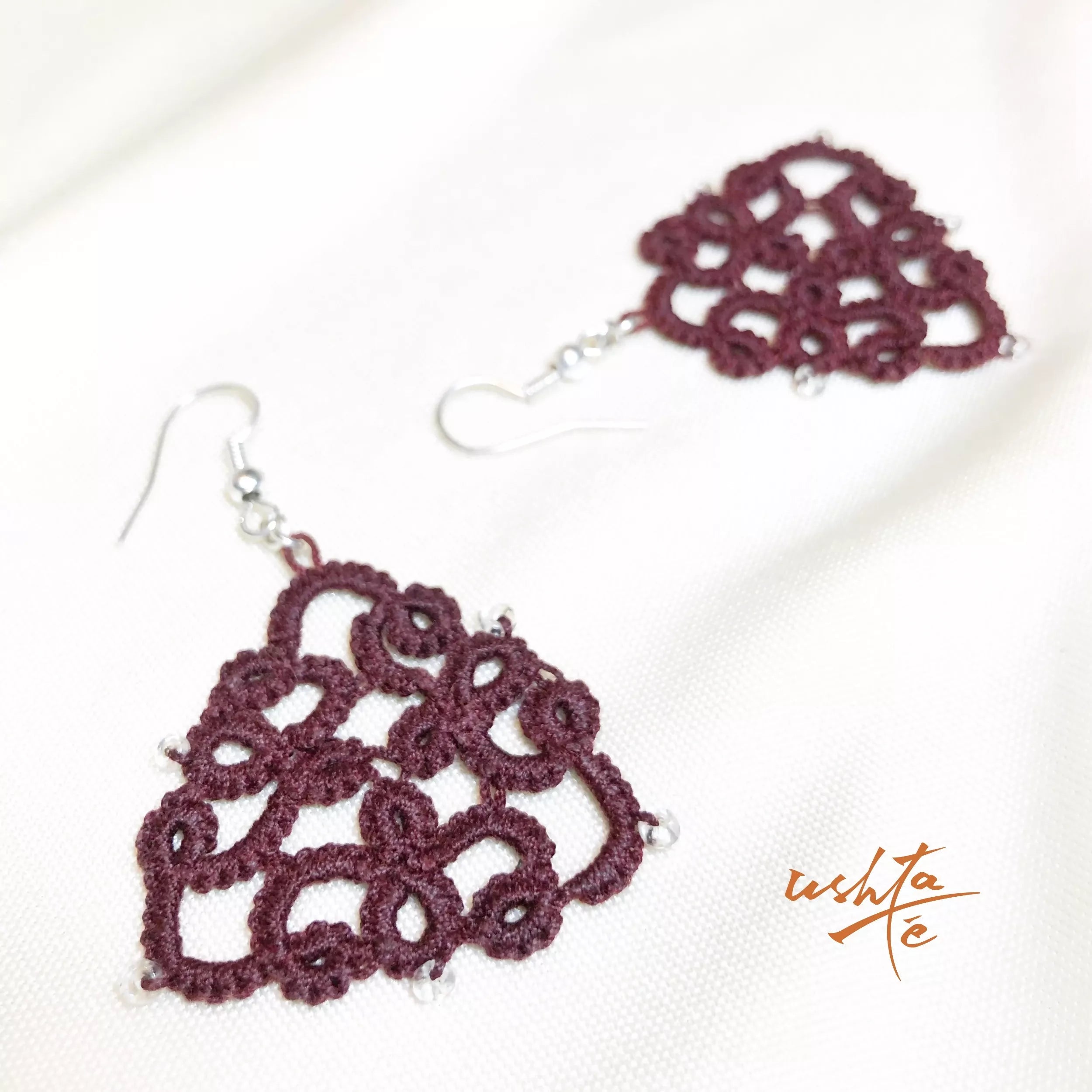 Lose yourself in the maze of these Maroon lace earrings, tatted with cotton yarn & glass beads