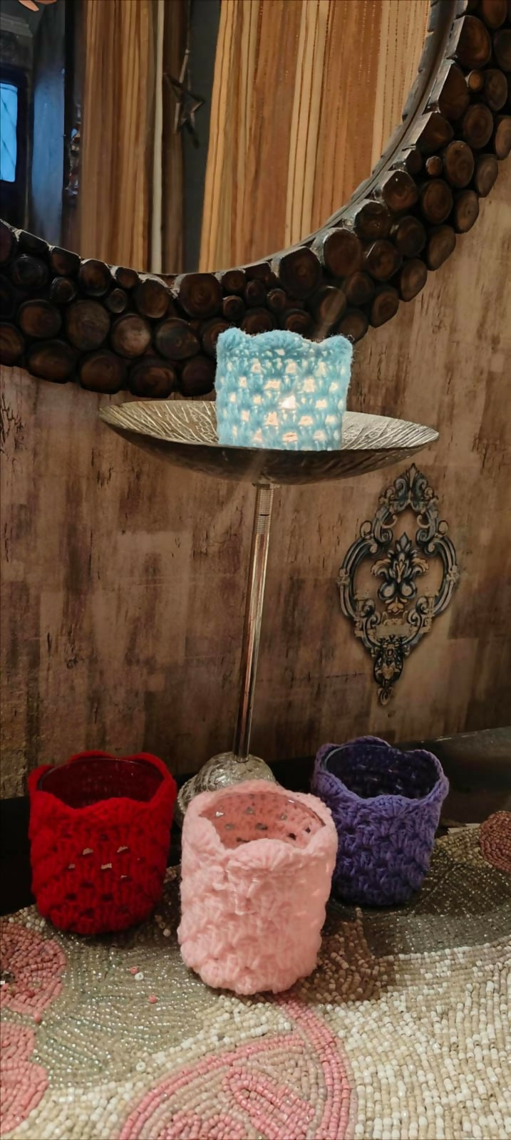 Artisanal 2-inch glass tea light holders adorned with vibrant crochet cozies in blue, red, pink, and purple. Each handcrafted piece offers customization possibilities while preserving artistic elegance—a colorful statement blending tradition with sophistication.