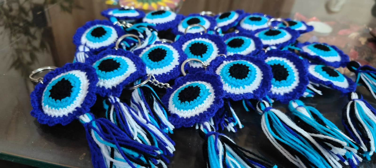 A vibrant, handmade evil eye charm crocheted in blue, white, and black yarn, finished with a beaded tassel and keychain ring. It's a stylish accessory for protection.