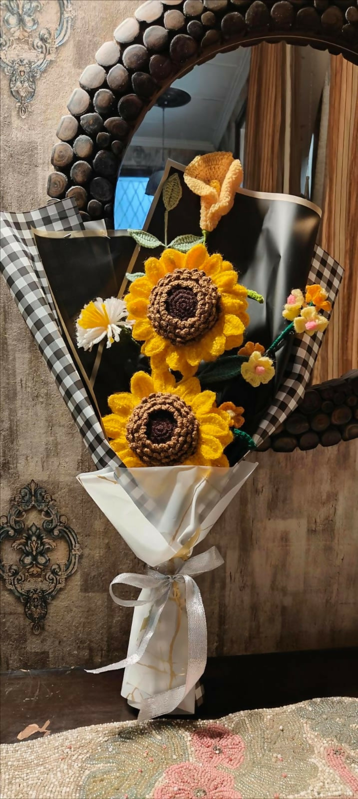 This is a beautiful, handcrafted crocheted sunflower bouquet featuring two large, double-layered sunflowers, a delicate calla lily, a forget-me-not stick, and daisy buds. It's wrapped stylishly in black and white checkered and Korean paper.