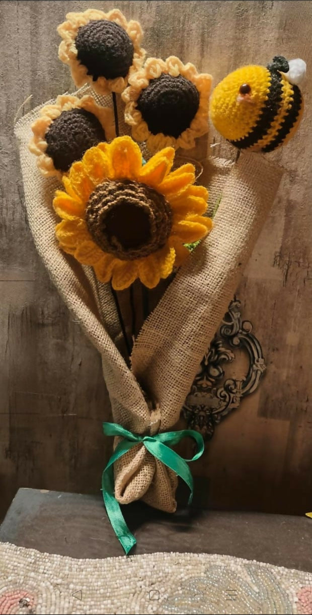 A vibrant, handmade bouquet featuring two double-layer sunflowers, a calla lily, and filler flowers. It's elegantly wrapped in black-and-white checkered and Korean paper, secured with a bow.