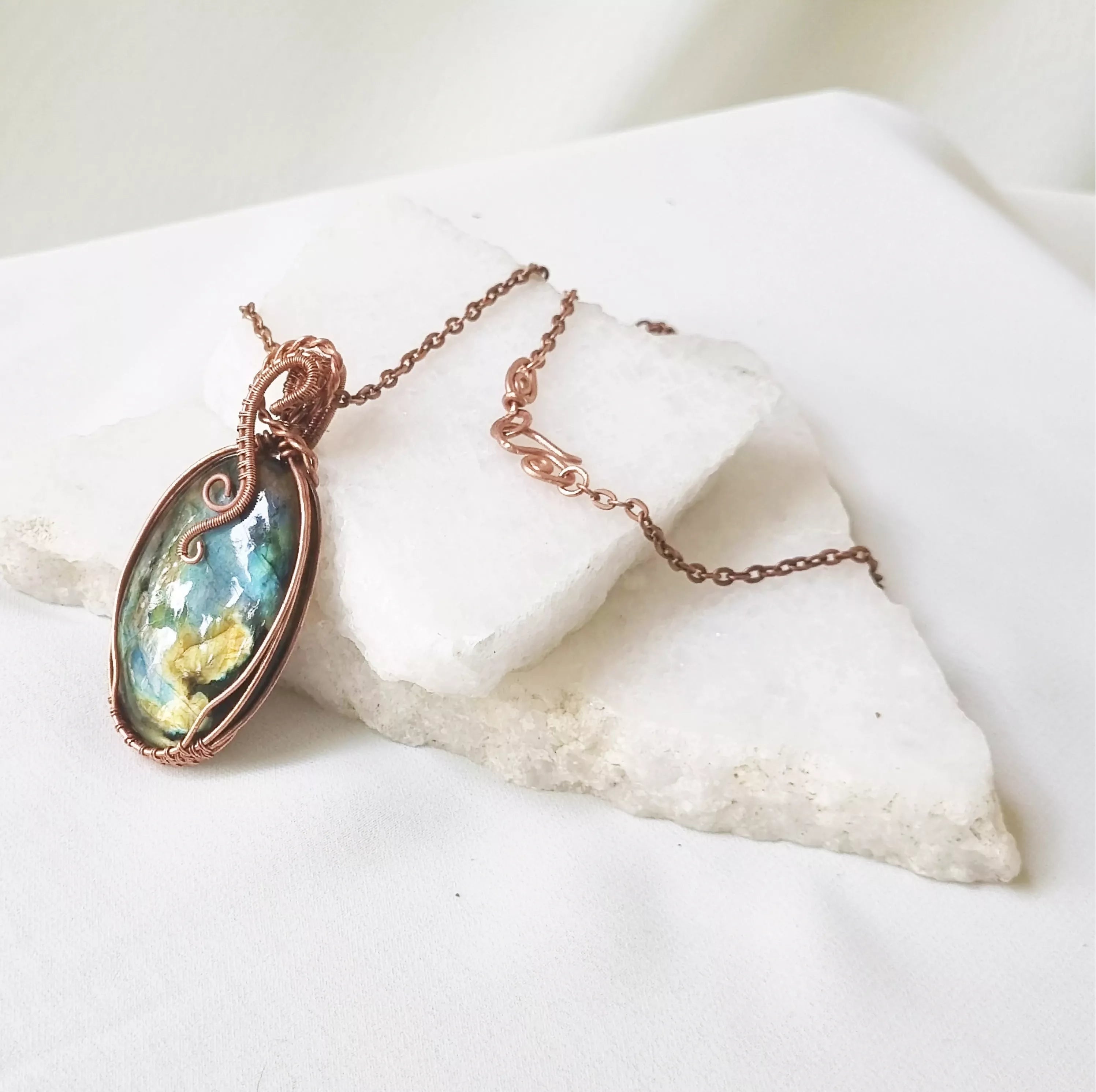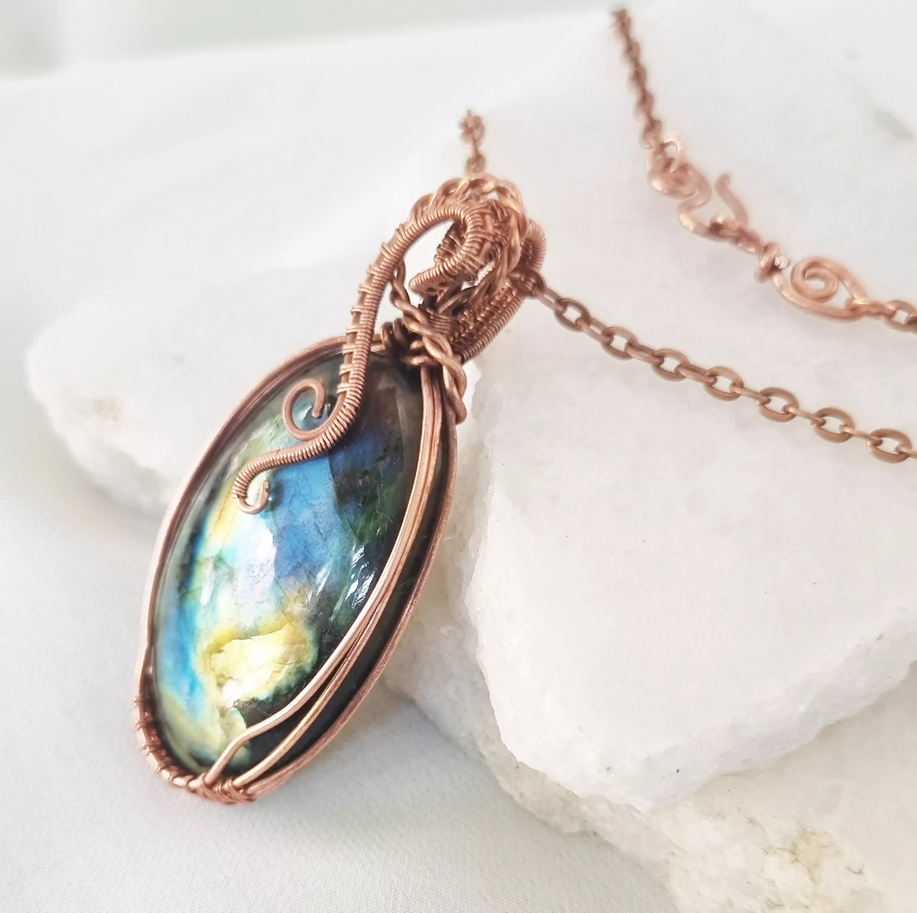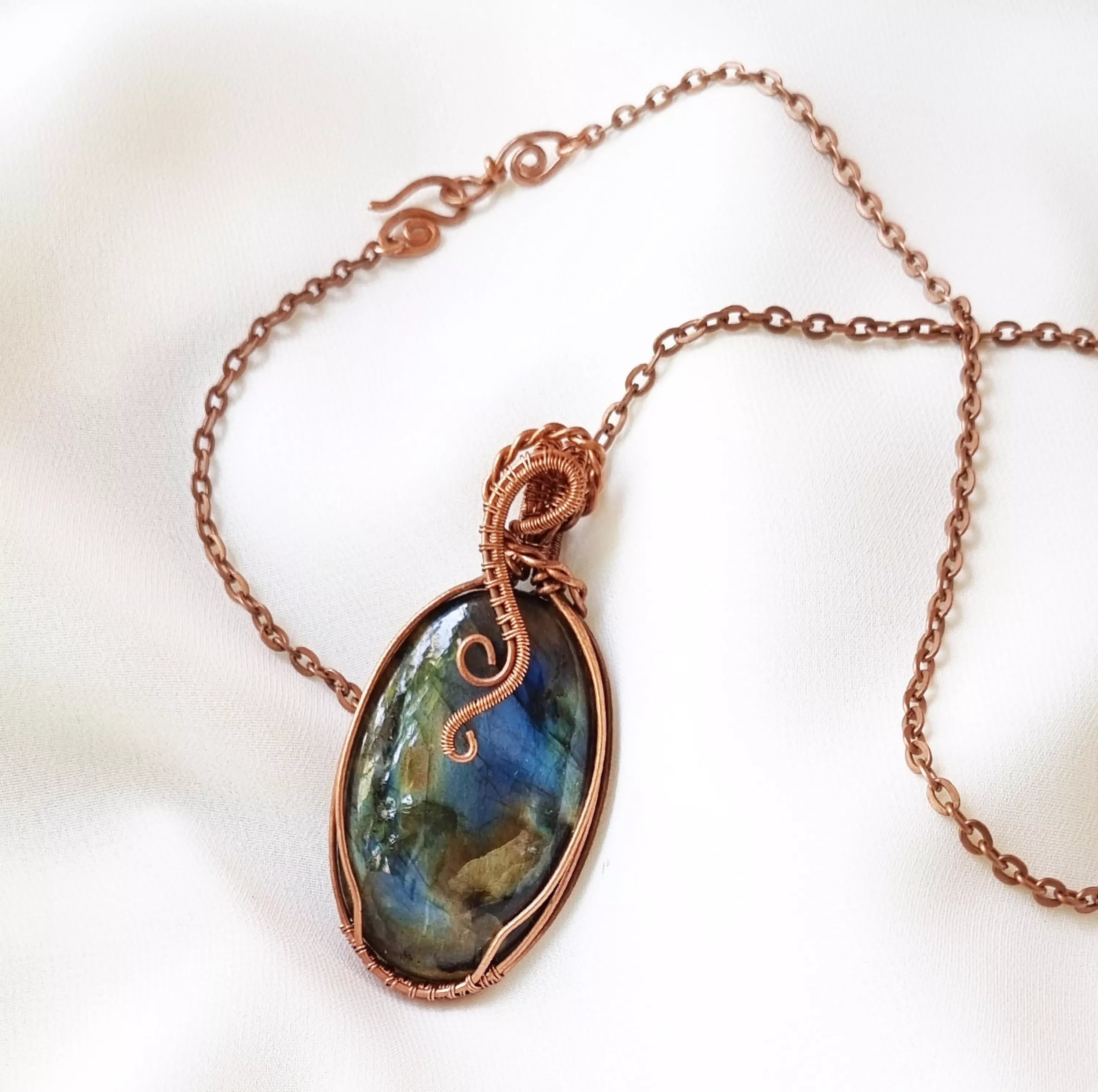 This gorgeous Labradorite and Copper pendant is good for the respiratory and digestive systems. it is a soothing gemstone that clears anxiety. It enhances artistic ambition and helps connect with cosmic energy.