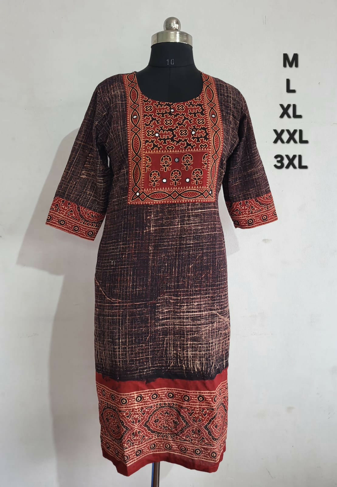 This elegant Ajrakh kurti blends traditional hand block prints with earthy tones and intricate motifs. Crafted from soft cotton, it offers comfort with cultural charm. The detailed yoke and border patterns enhance its ethnic beauty, perfect for casual or festive wear.