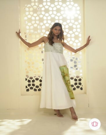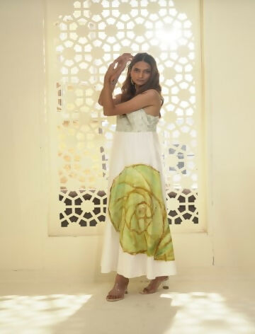 This is a white A-line maxi dress featuring a sequined bodice and a hand-painted, spiral floral motif in shades of green and gold on the skirt. It offers a chic, resort-wear look.