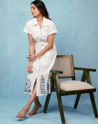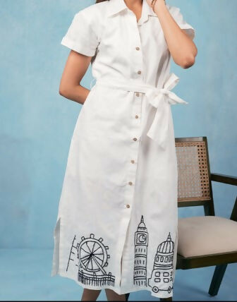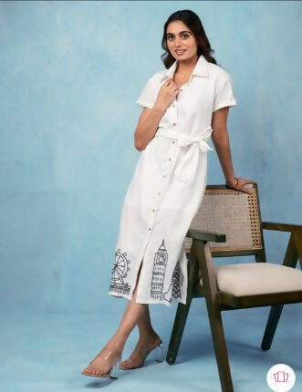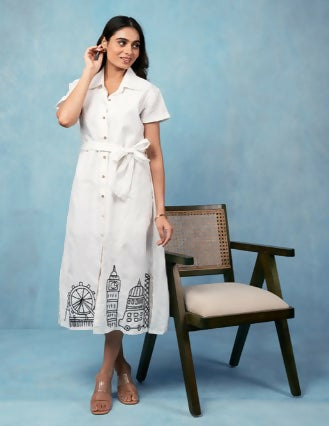 This is a white cotton shirt midi dress with a straight hem and a self-tie belt. The lower skirt features striking black embroidered city skyline motifs, including landmarks like the London Eye and Big Ben, for a cosmopolitan touch.