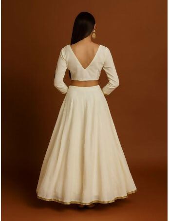 This is a white cotton lehenga set with a V-neck crop choli and three-quarter sleeves. The statement piece is the skirt, which features a large, hand-painted or printed grey elephant motif adorned with vibrant cultural patterns.