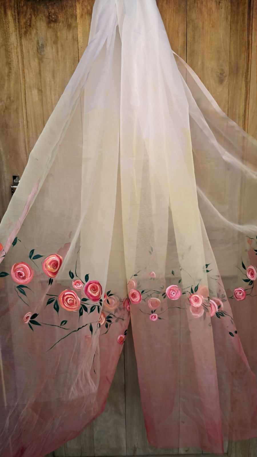 Elevate your look with this dreamy ombre organza dupatta, blending soft white, buttery yellow, and blush pink hues — finished with delicate hand-painted florals 🌷✨