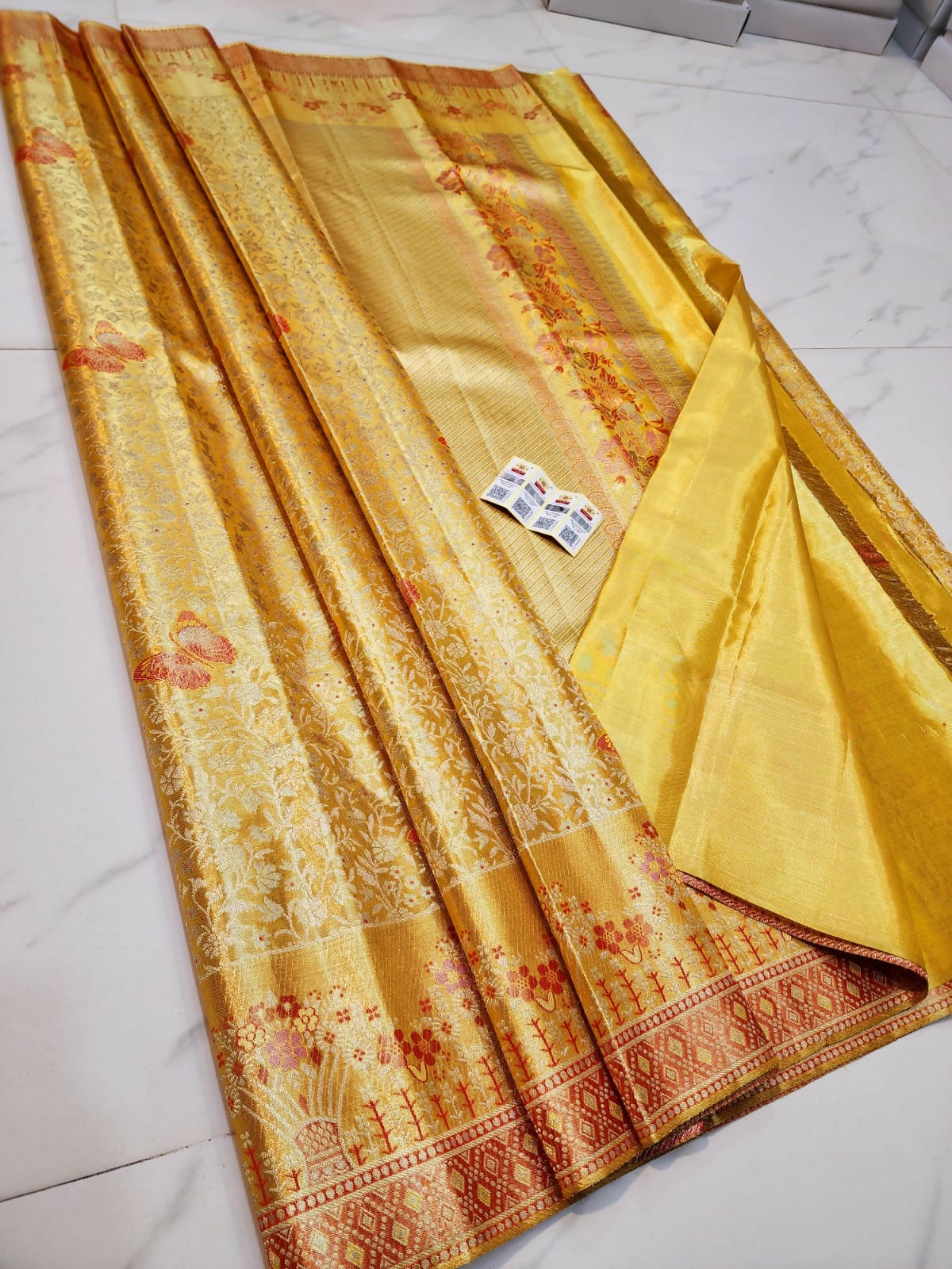 Experience the luxury of this Full Golden Shade Kanchi Pattu Tissue Saree, exquisitely handwoven by Kanchi Maharani Handlooms. Crafted with shimmering, delicate tissue silk and enriched with lavish 2 Gram Gold Zari borders and motifs, this saree offers unparalleled elegance and a lighter, majestic drape, perfect for grand celebrations.