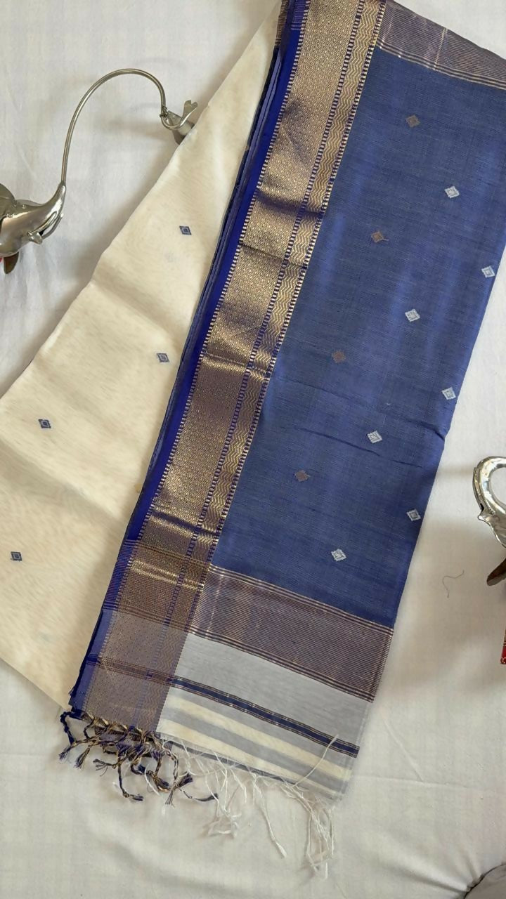 A dual-tone silk-blend fabric with diamond bootis. It pairs an ivory white section with a deep indigo blue section, both featuring a rich gold and navy blue zari border, perfect for a luxurious, traditional look.
