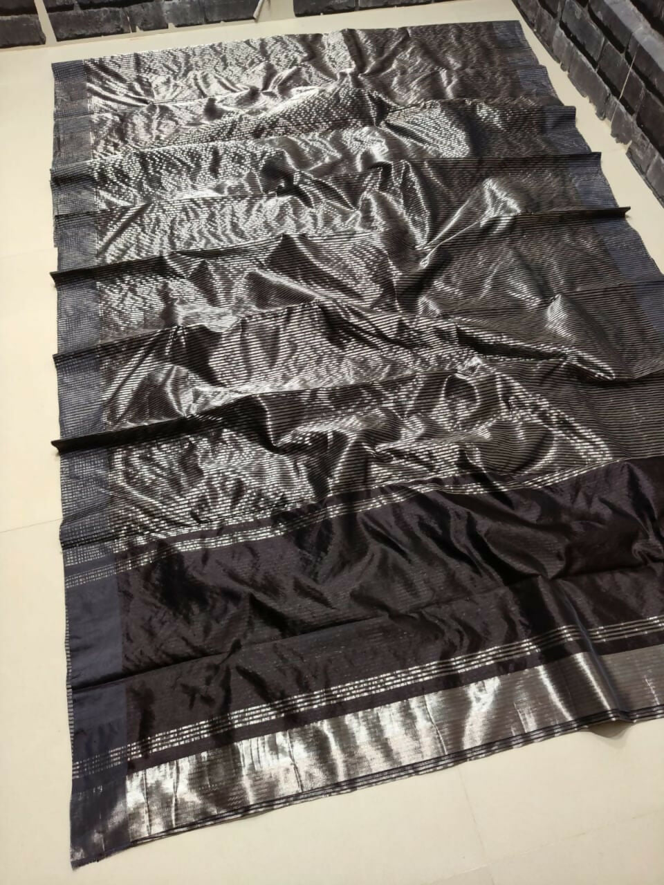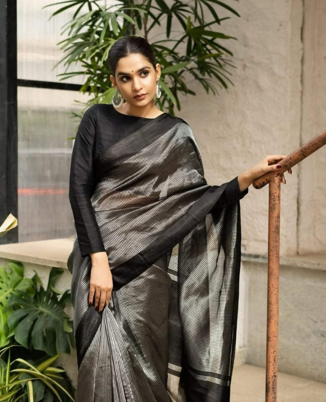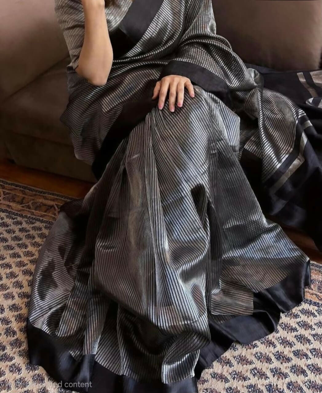 This saree is crafted from Tissue Silk with a dramatic Pattu-style stripes weaving pattern. The fabric is lightweight and semi-sheer, boasting a striking metallic sheen that catches the light. The black and silver/grey combination offers a contemporary yet traditional look, perfect for evening events.