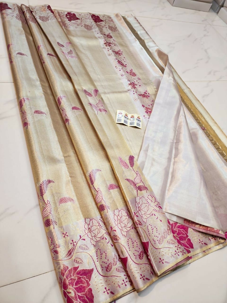 These are Pastel Shade Pure Handloom Kanchi Pattu Tissue Sarees, exquisitely handmade by Kanchi Maharani Handlooms. Featuring delicate, multicolor motifs and shimmering 2-gram gold zari, they offer lightweight elegance and a sophisticated, contemporary drape.