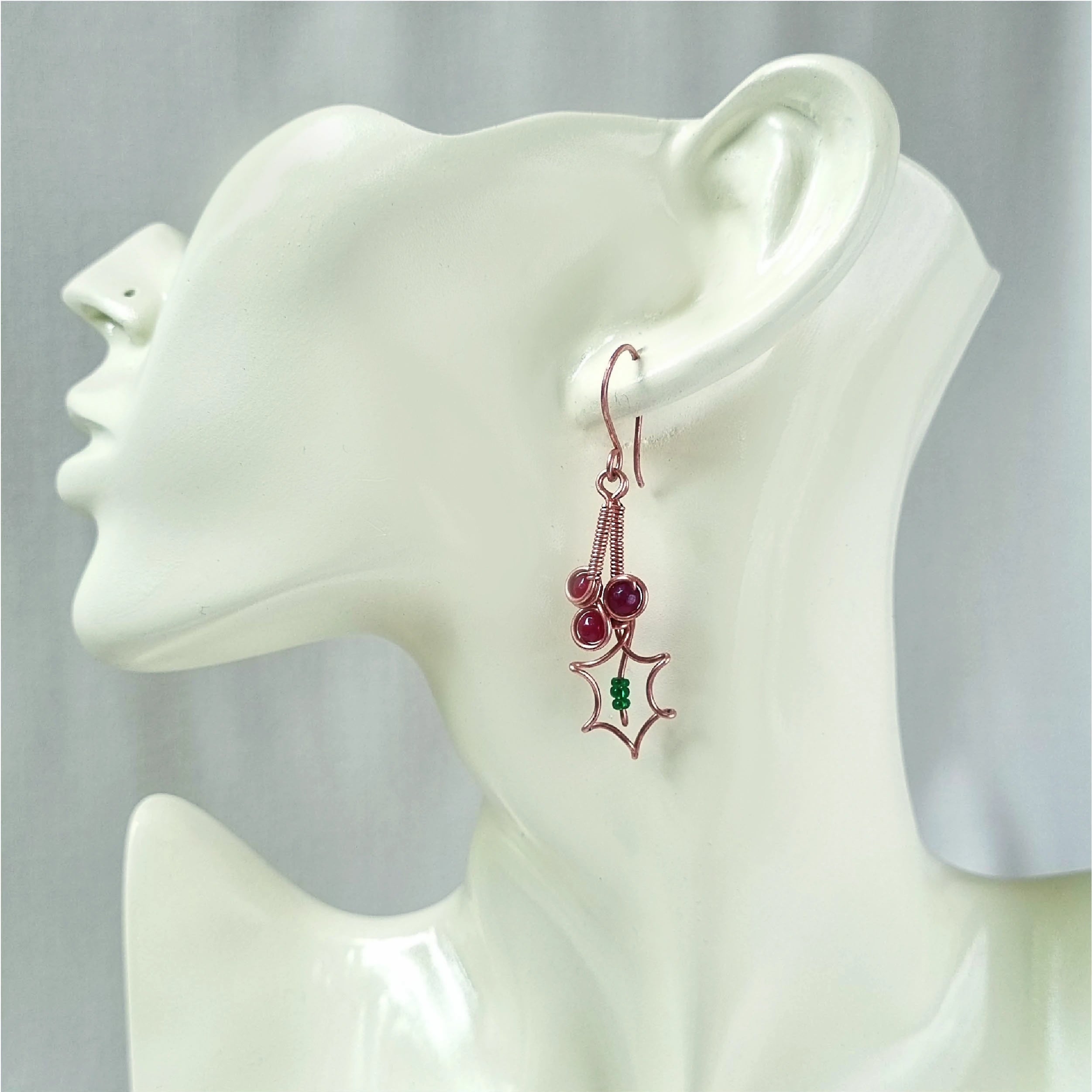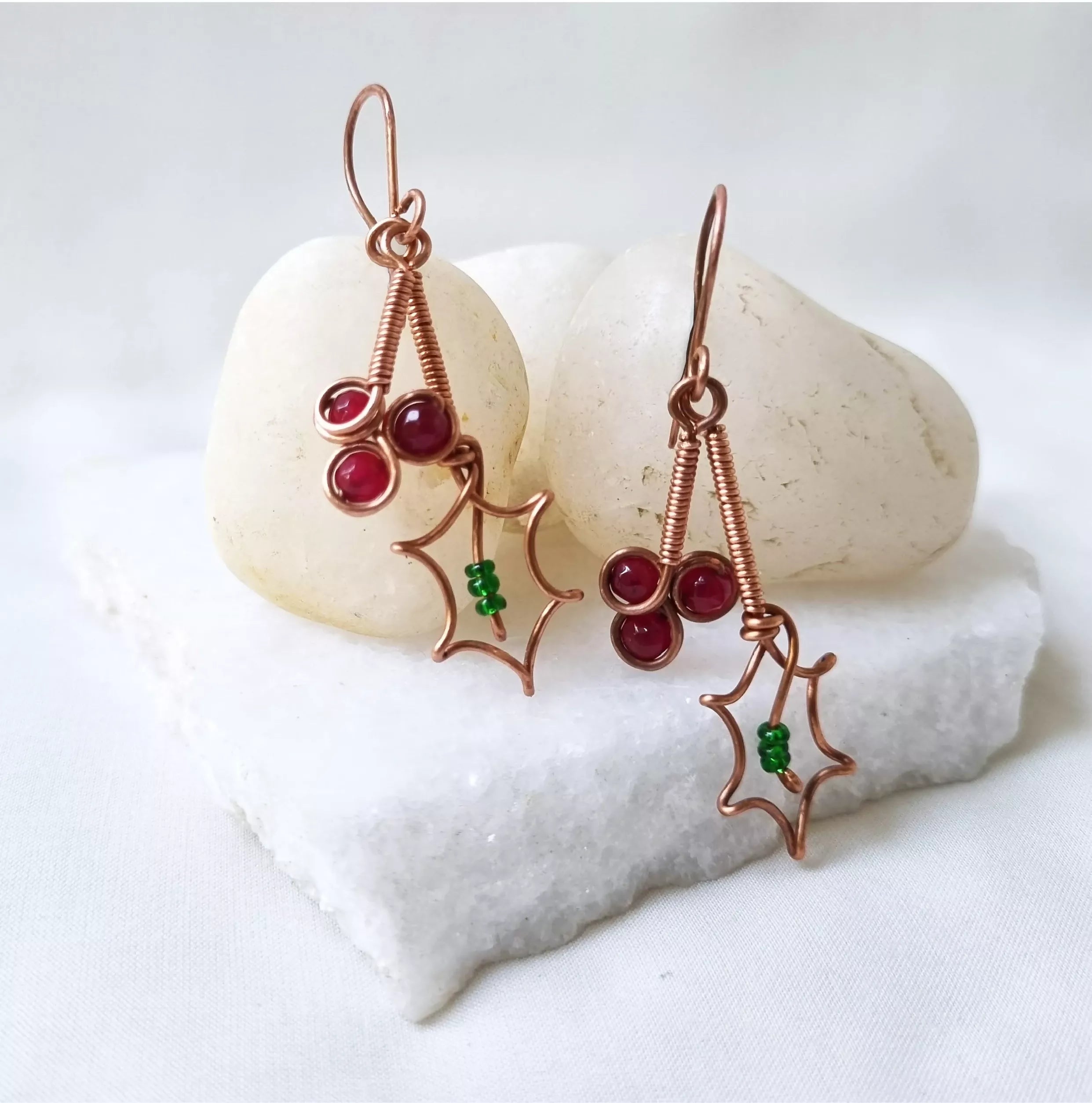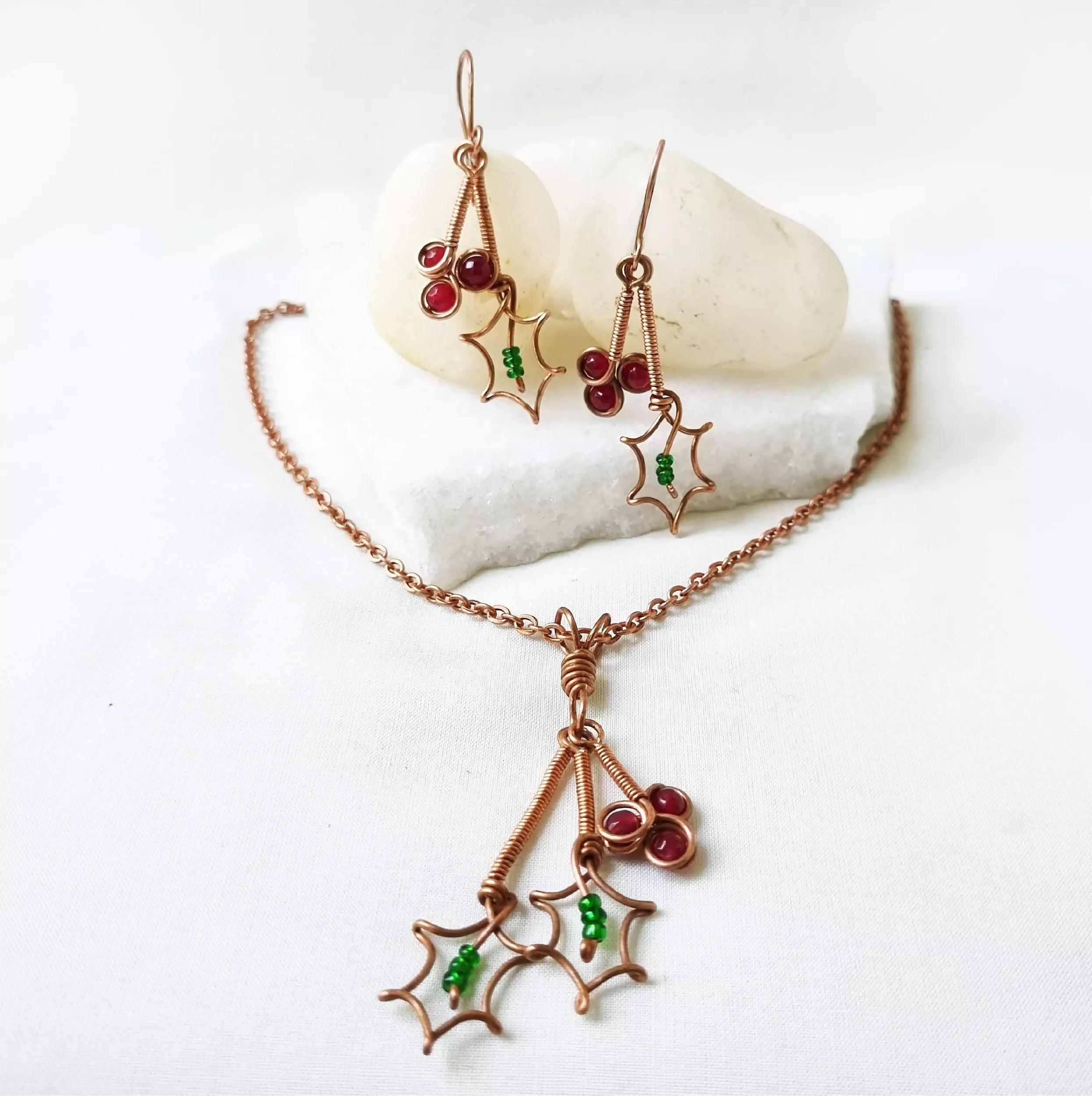 This beautiful set has been handcrafted with pure Copper, Red Jade stone and green glass beads. The healing energy of Red Jade will raise your physical vitality, passion, and strength by eliminating fear, doubt, and worry.