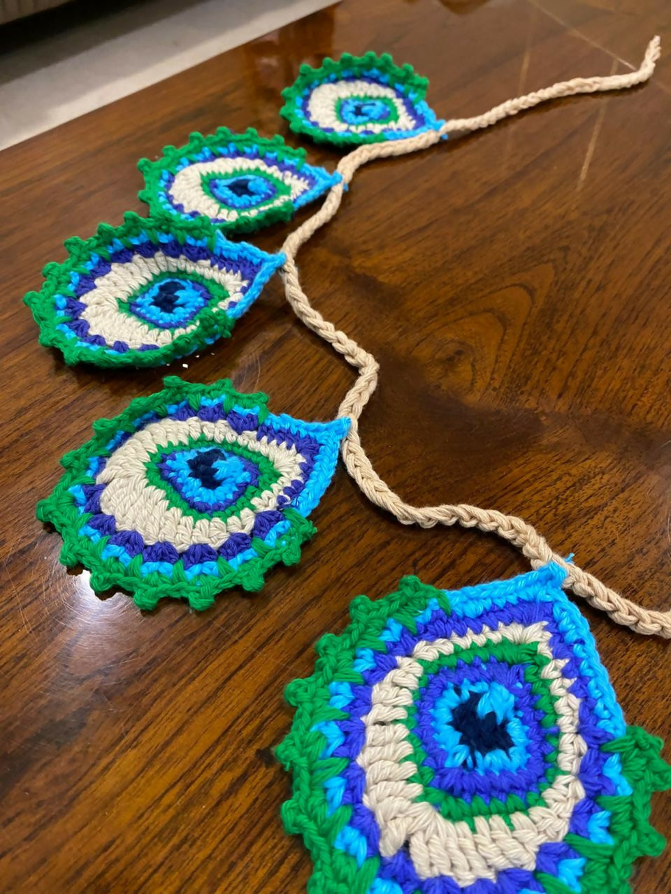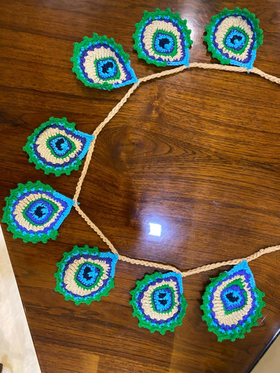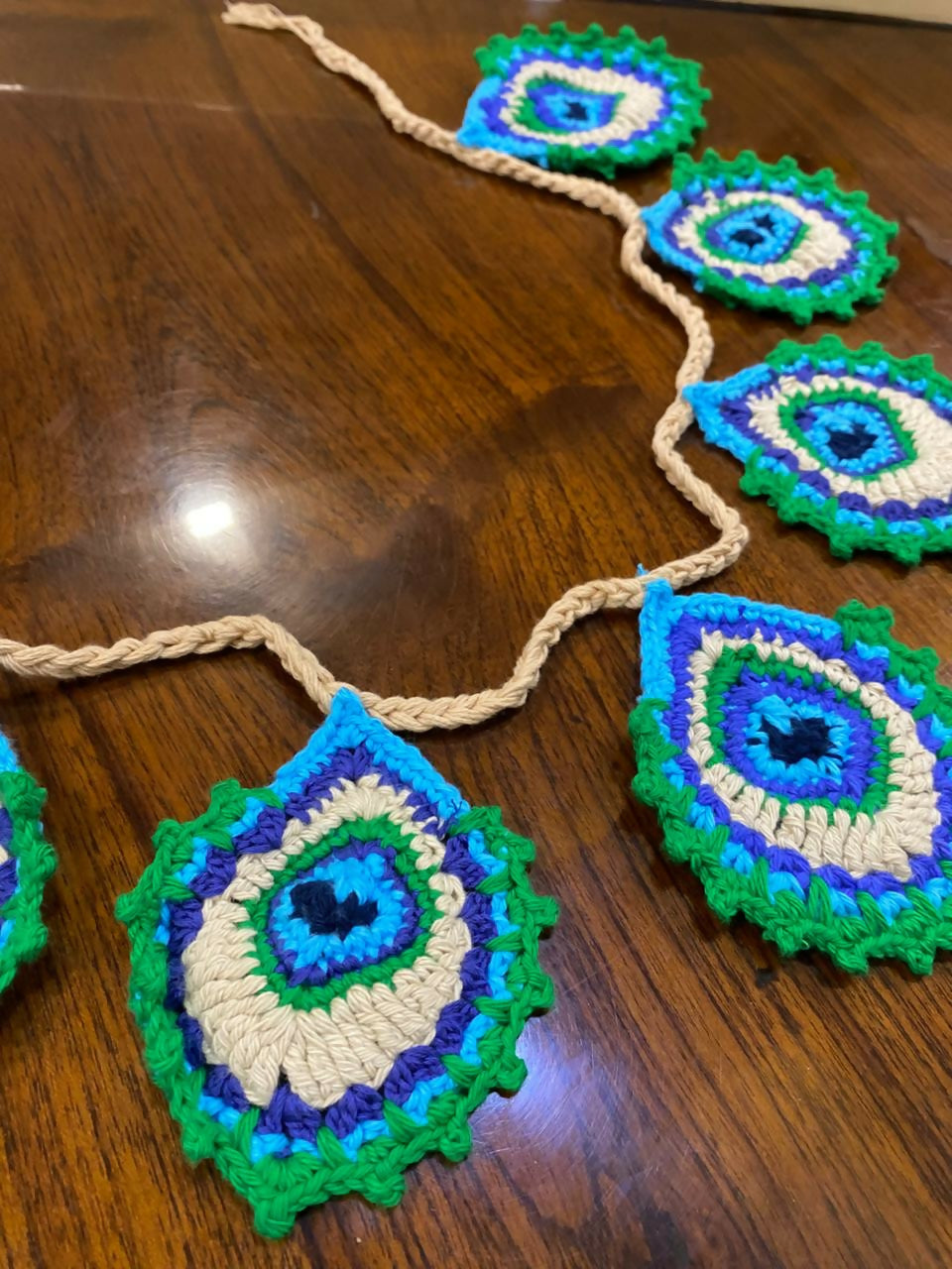 Handmade peacock feather toran crafted with 100% cotton yarn. First time dry clean for best care, later gentle wash. Can be ironed. Perfect for adding vibrant charm to home décor.