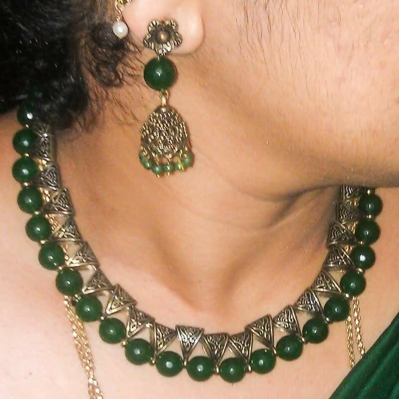 One of a kind, unique handmade design with Semi Precious Gemstone Jade Green 8mm onyx round faceted beads choker necklace. This one has mehendi gold triangle shaped charms giving it a eye catching design. It comes with matching jhumka earrings