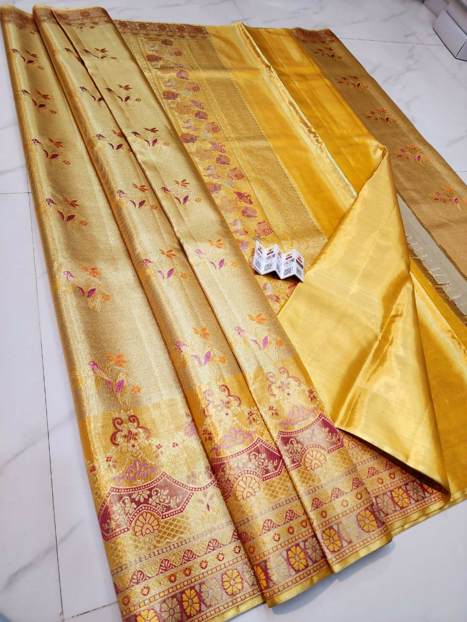 Experience the luxury of this Full Golden Shade Kanchi Pattu Tissue Saree, exquisitely handwoven by Kanchi Maharani Handlooms. Crafted with shimmering, delicate tissue silk and enriched with lavish 2 Gram Gold Zari borders and motifs, this saree offers unparalleled elegance and a lighter, majestic drape, perfect for grand celebrations.