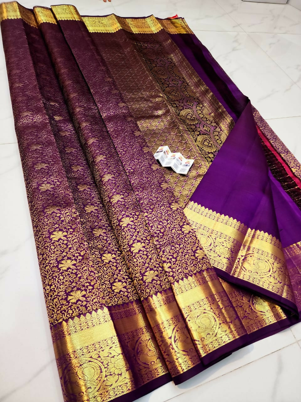 These are Pure Handloom Kanchi Pattu Sarees from Kanchi Maharani Handlooms, Kanchipuram, meticulously woven with 1 gram gold zari. They feature fully handmade intricate designs, embodying traditional South Indian craftsmanship and luxury.