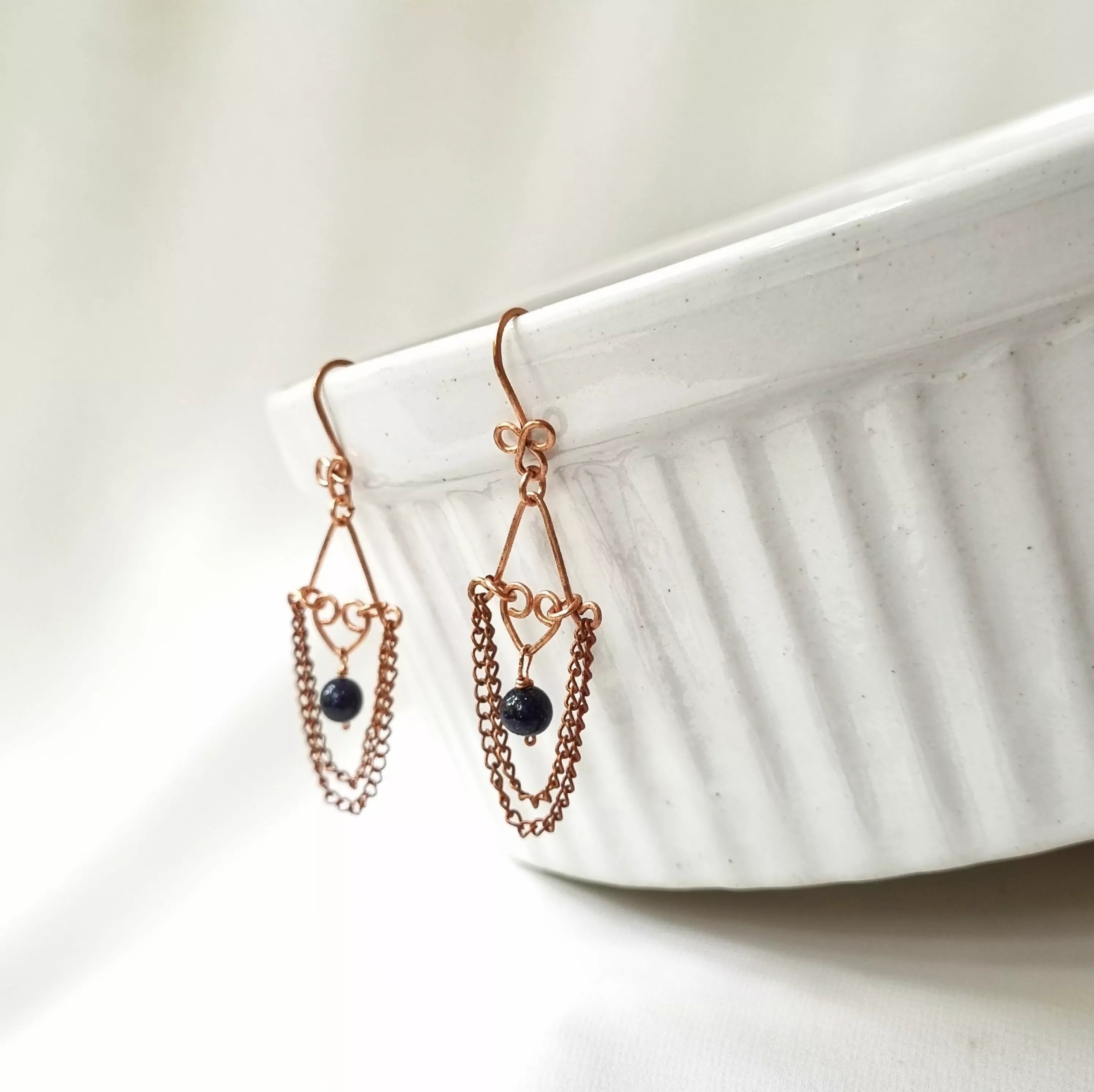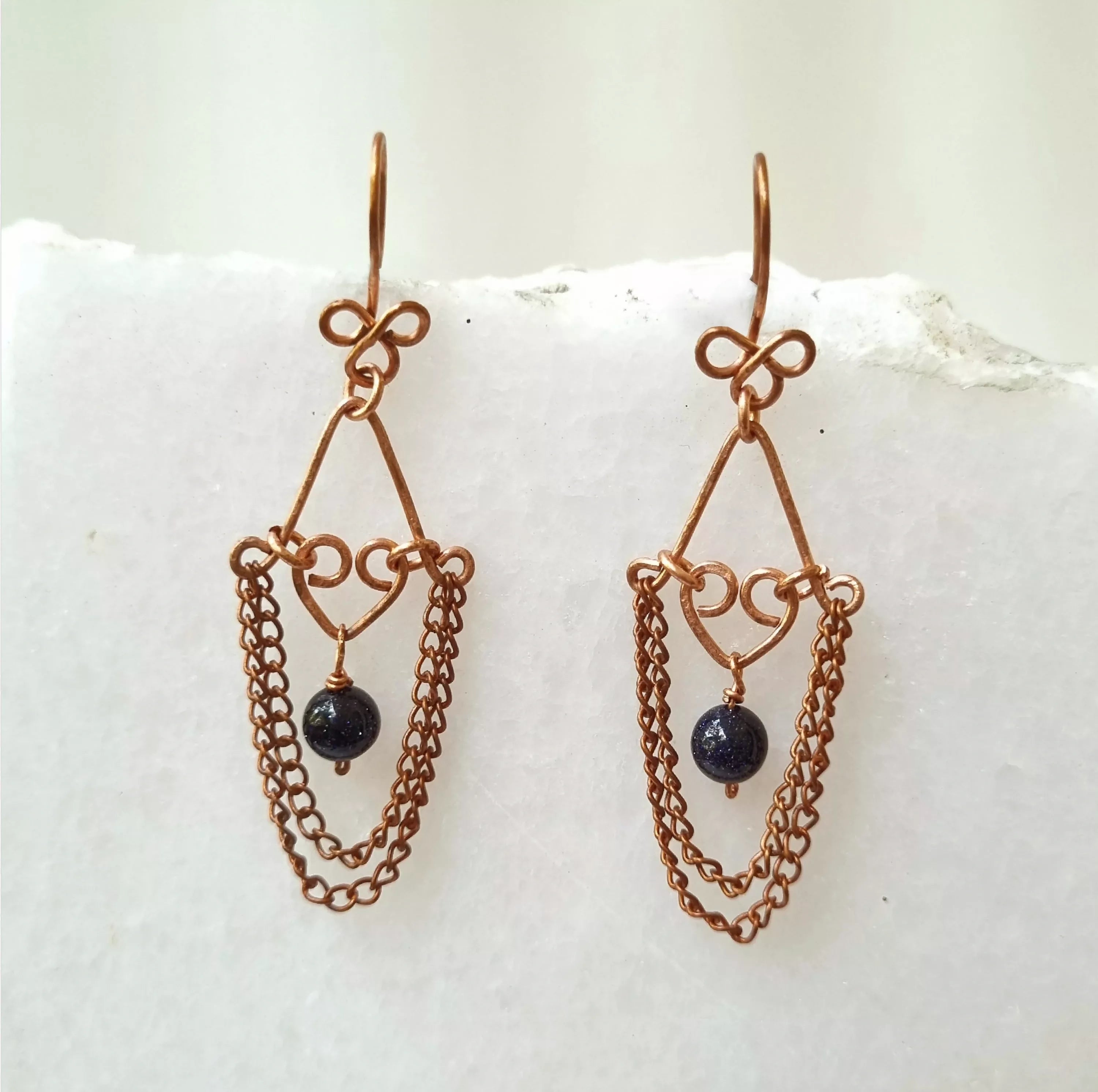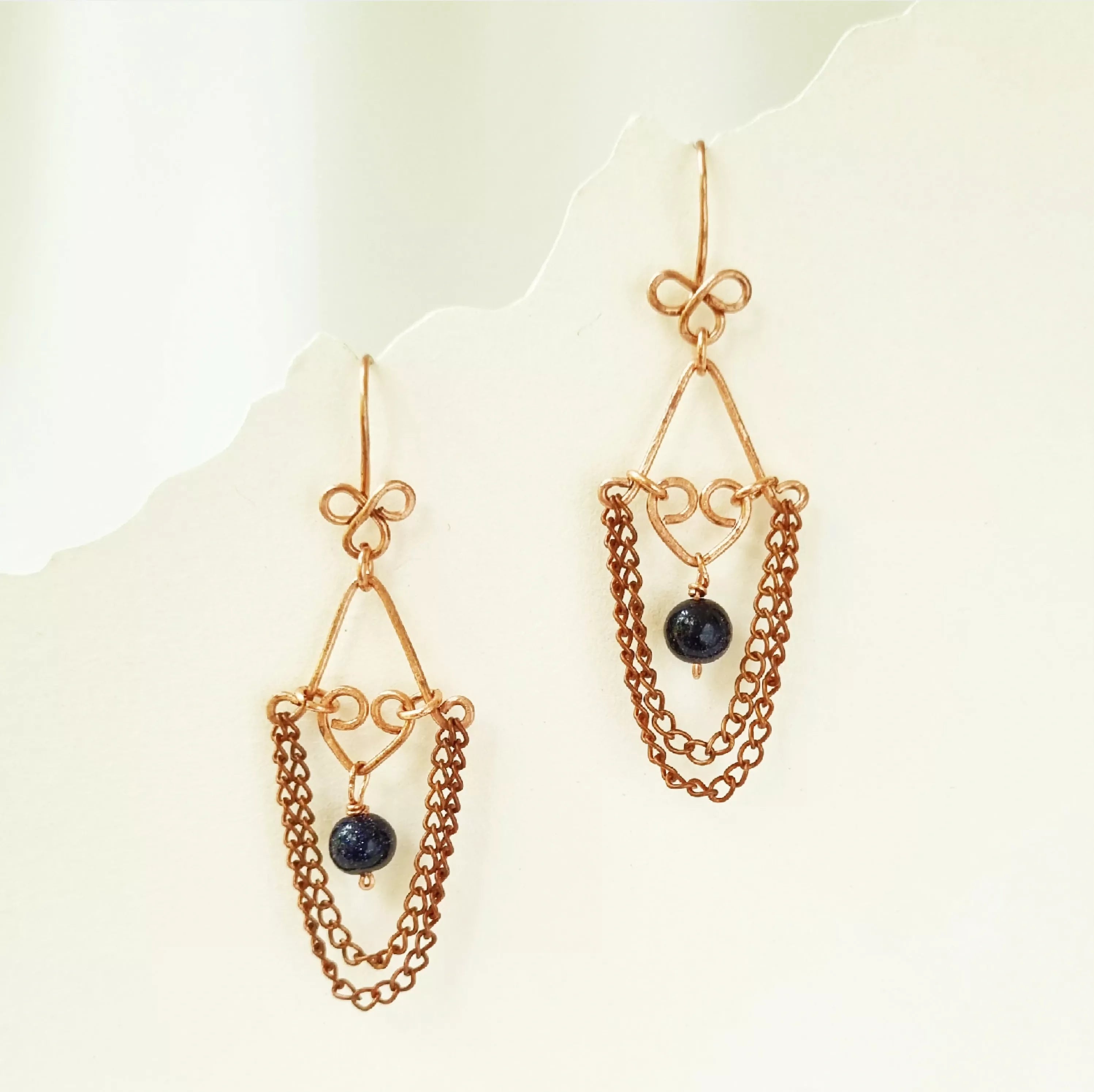 This pair of handcrafted Copper and Blue Goldstone Earrings brings you good fortune that can open pathways of intuition and psychic awareness. It is used as a crystal for protection at night. It helps in healing joint issues, improving circulation, calming anxiety and detoxing the body.
