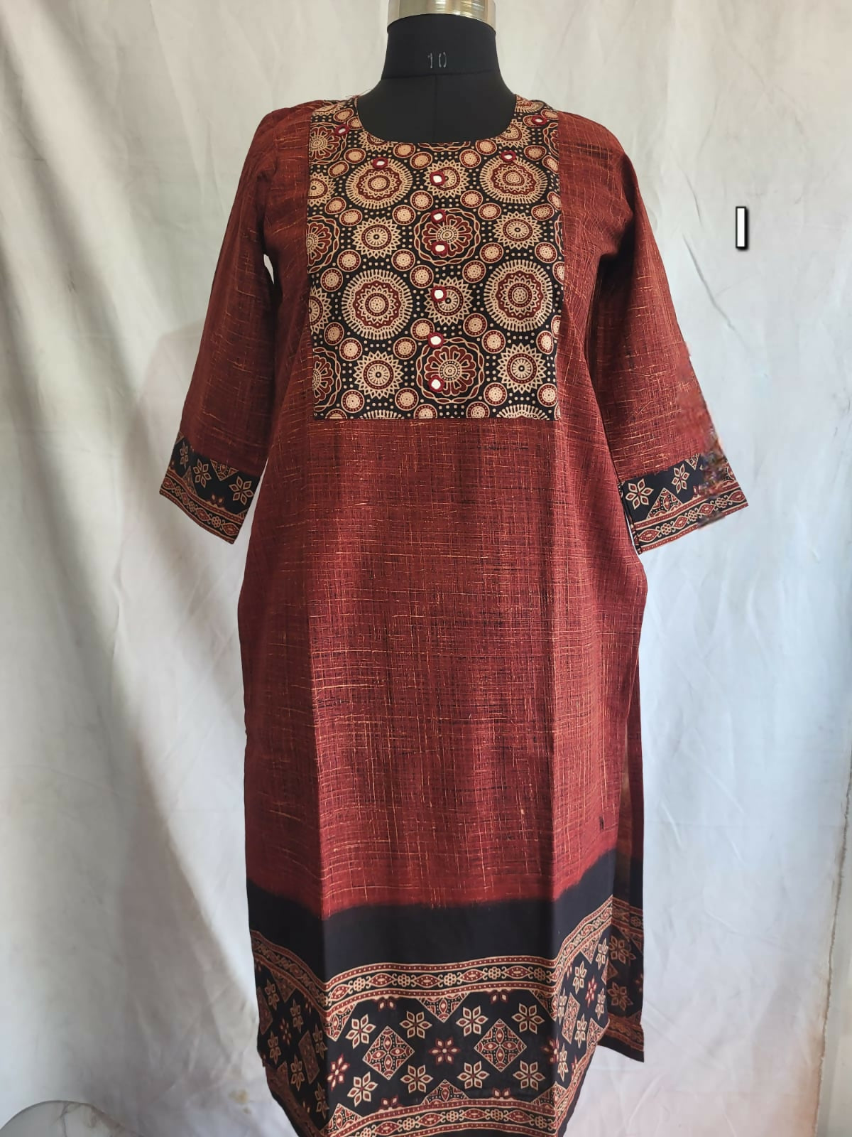This elegant Ajrakh kurti blends traditional hand block prints with earthy tones and intricate motifs. Crafted from soft cotton, it offers comfort with cultural charm. The detailed yoke and border patterns enhance its ethnic beauty, perfect for casual or festive wear.