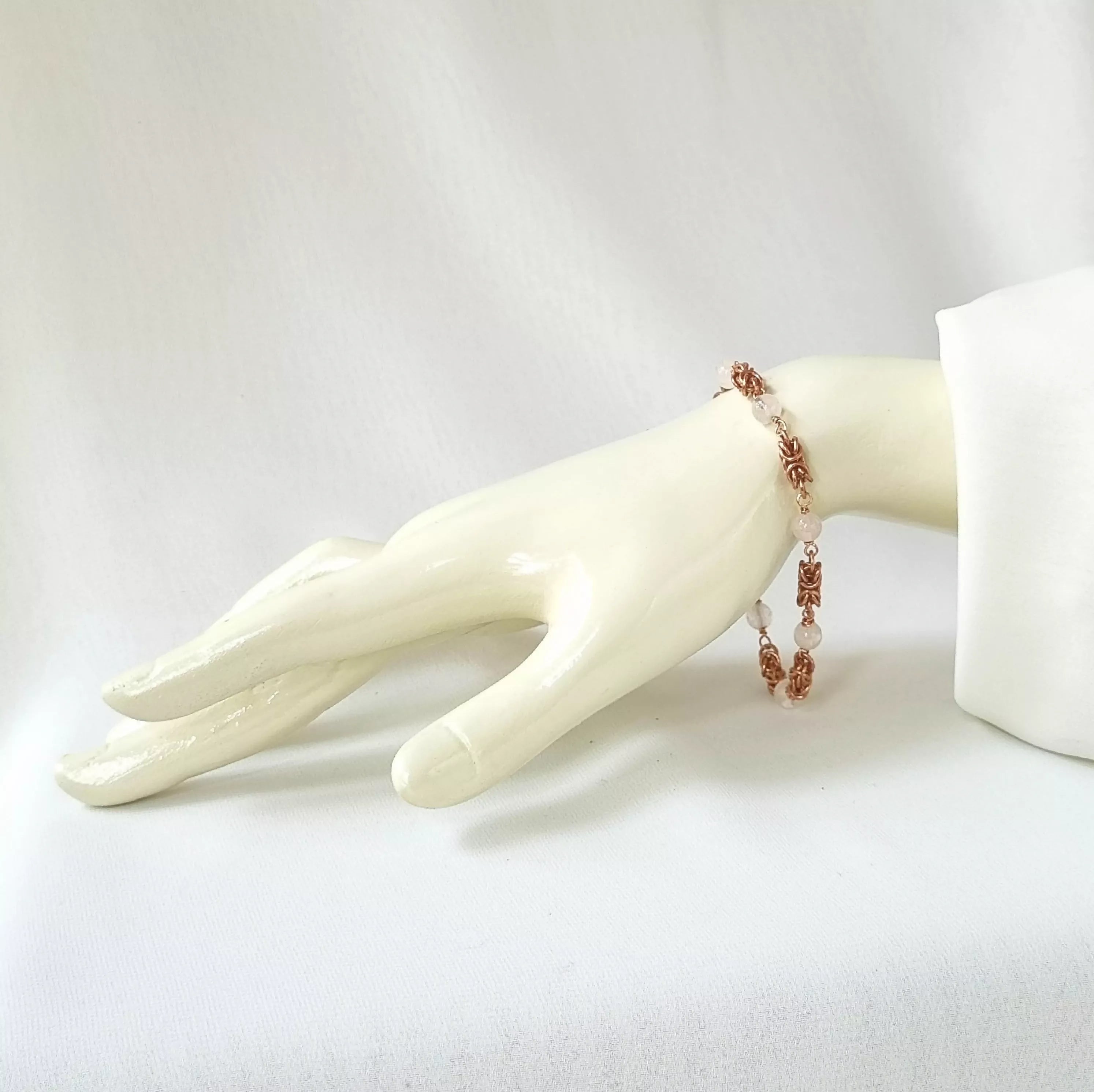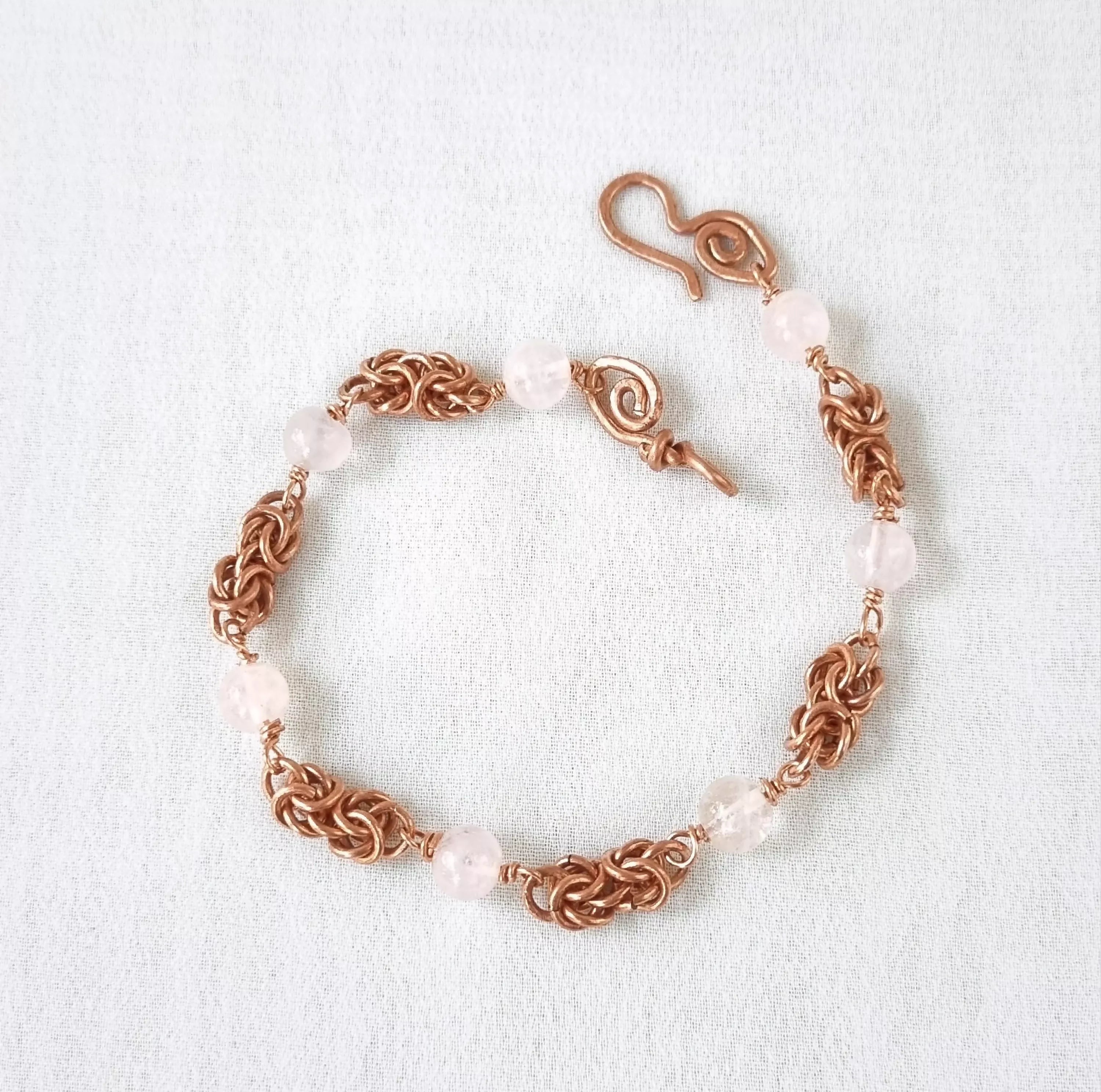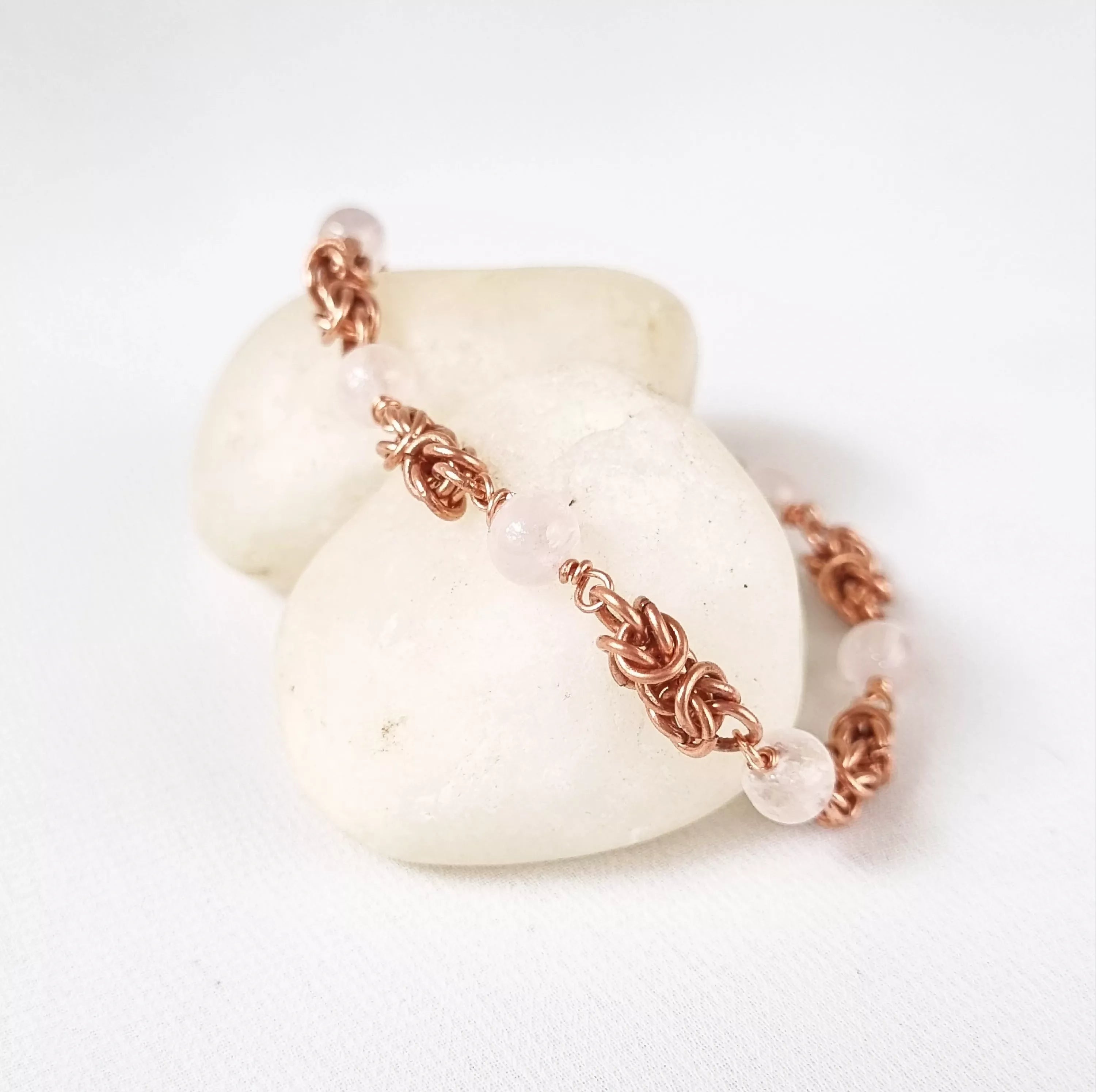 This elegant rose quartz and copper bracelet is perfect for everyday wear. This crystal inspires compassion and boosts calming and peaceful vibes. Wearing copper regularly improves the immune system. It has antibacterial and antioxidant properties, and maintains blood pressure. It helps strengthen the bones and promotes absorption of minerals. It can improve skin health and helps in weight loss by reducing swelling.
