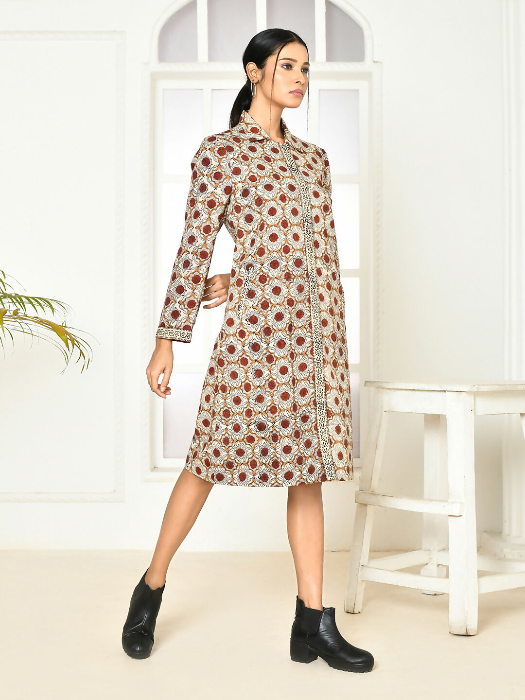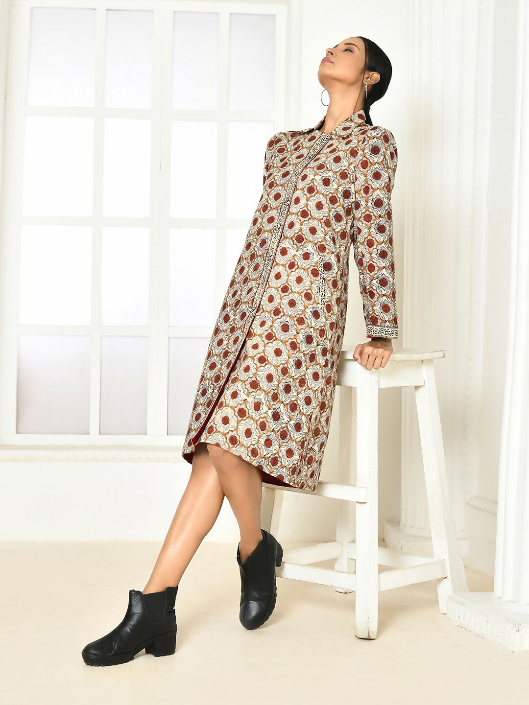 The Expressions By UV, Mia Women's Long Jacket in Off-White/Cream is made from soft 100% cotton. It features a geometrical printed work wear pattern and comfortable full sleeves. This long jacket offers a classic regular fit, making it a stylish and versatile layering piece. Available in sizes S, M, XL, XXL.