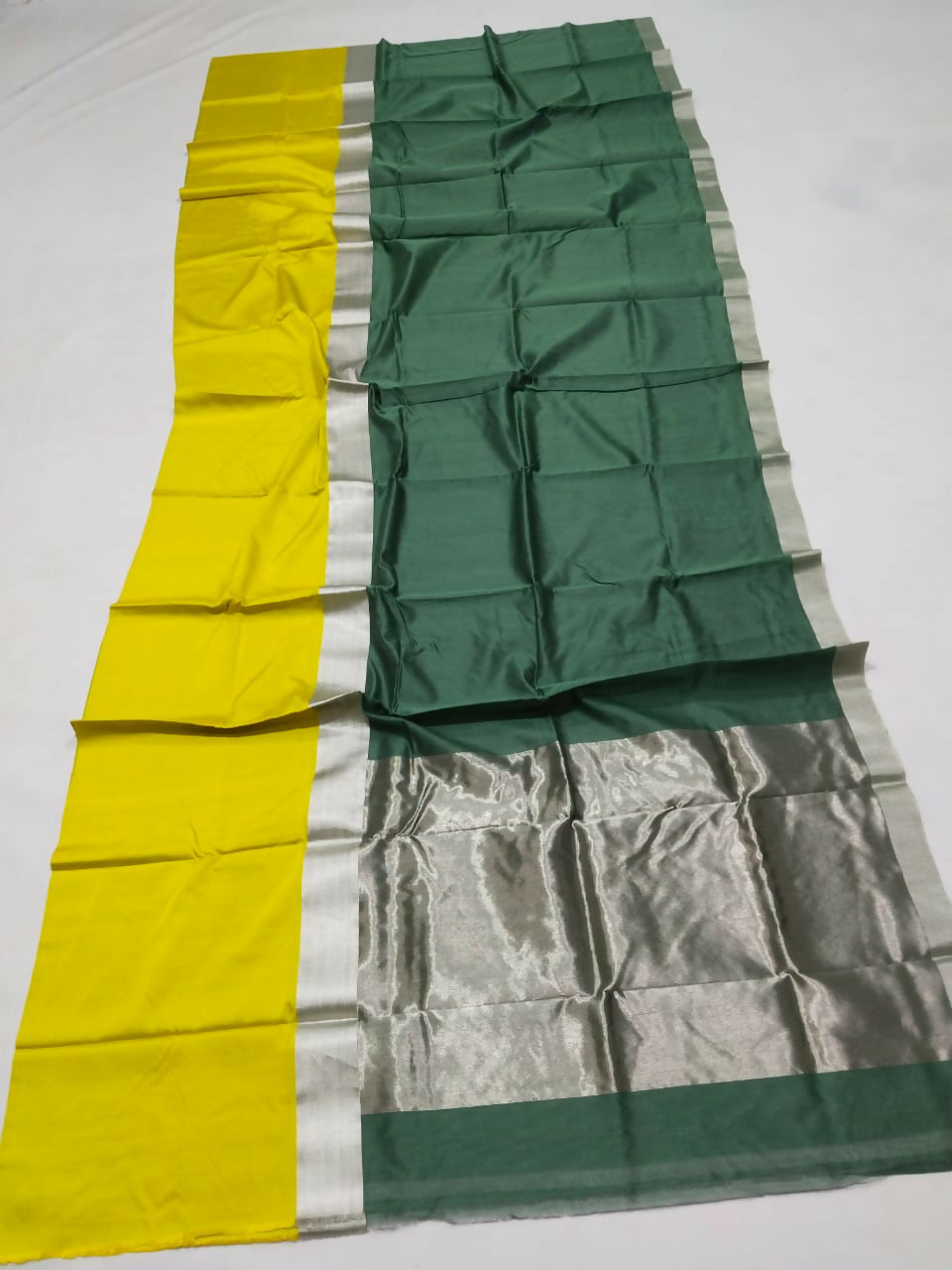 The image shows a striking Pattu Soft Silk Saree defined by its bold color-blocking. It features a rich Black body and a vibrant, contrasting Mustard Yellow/Lime pallu or end-panel. The saree is finished with a sleek metallic silver border and pallu segment, providing a modern, lustrous touch to the traditional soft silk texture.