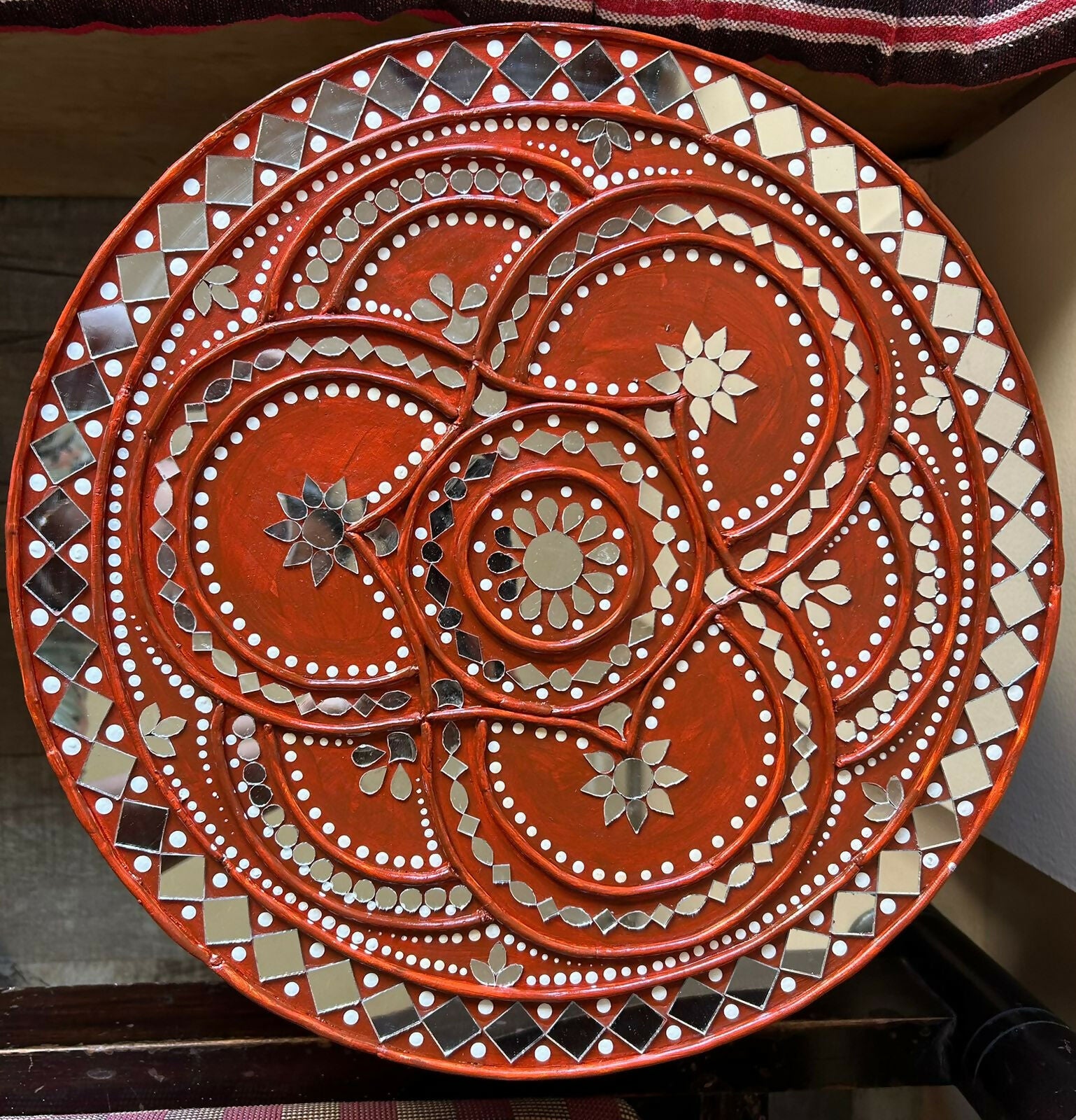 Handmade mandala wall plate in rich earthy tones, blending geometric and floral motifs with intricate mirror detailing—ideal for adding warmth and elegance to any decor theme.