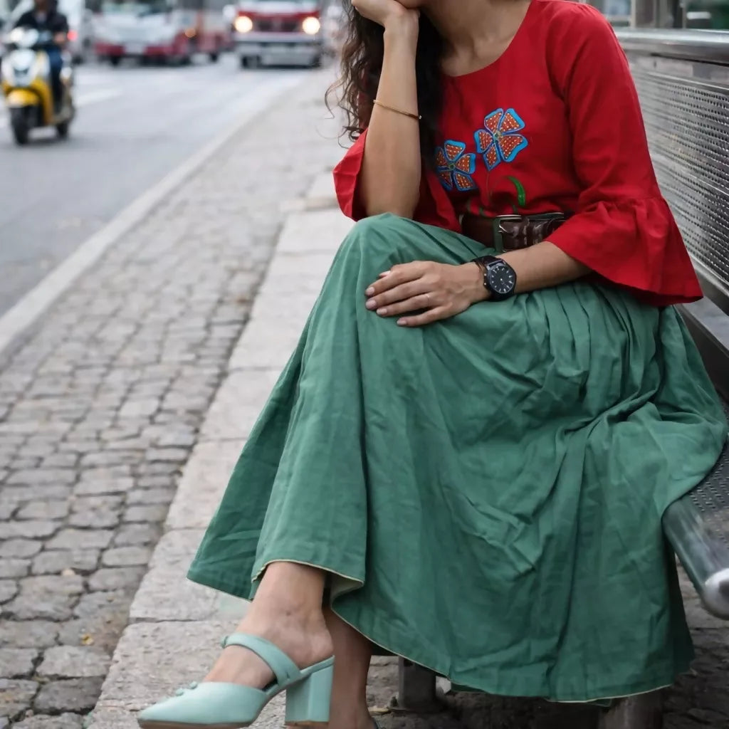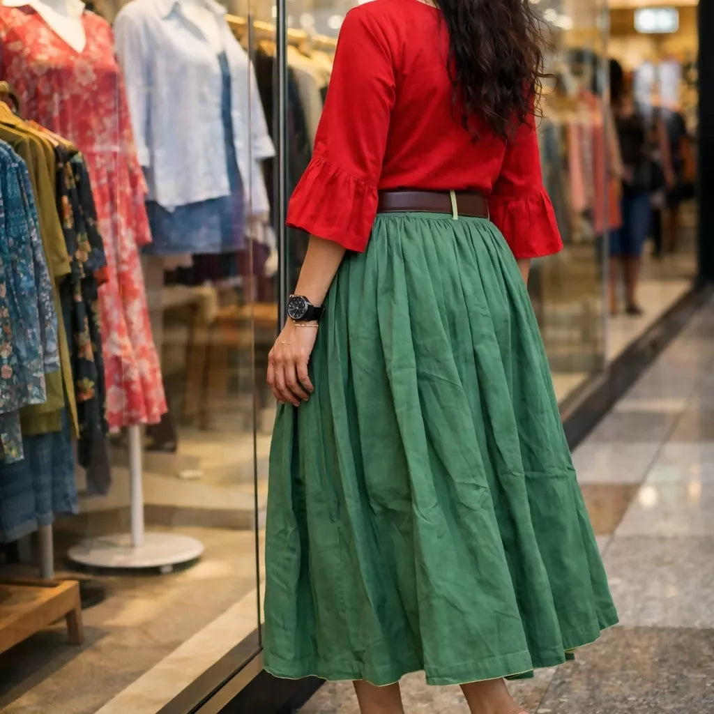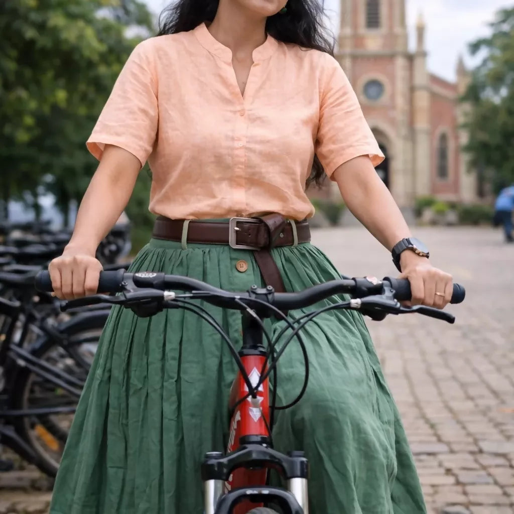 Calf length skirt in a handwoven Linen X Cotton fabric featuring a paper-bag waist with pleats at the front and belt loops. Buttons down the front, diagonal side pockets. This trendy and uber chic piece gives you a perfect feminine charm. The oh-so-trendy silhouette is bound to flatter any body type. You can pair this up with blouse top and high heels or flats to look like a stunner.
