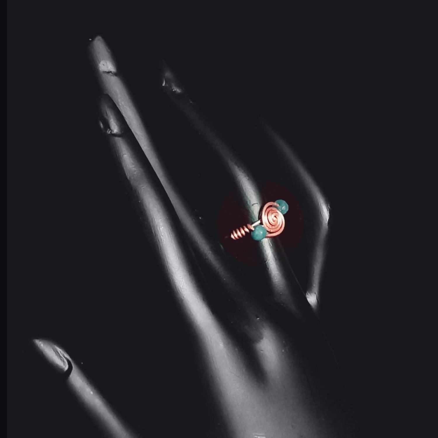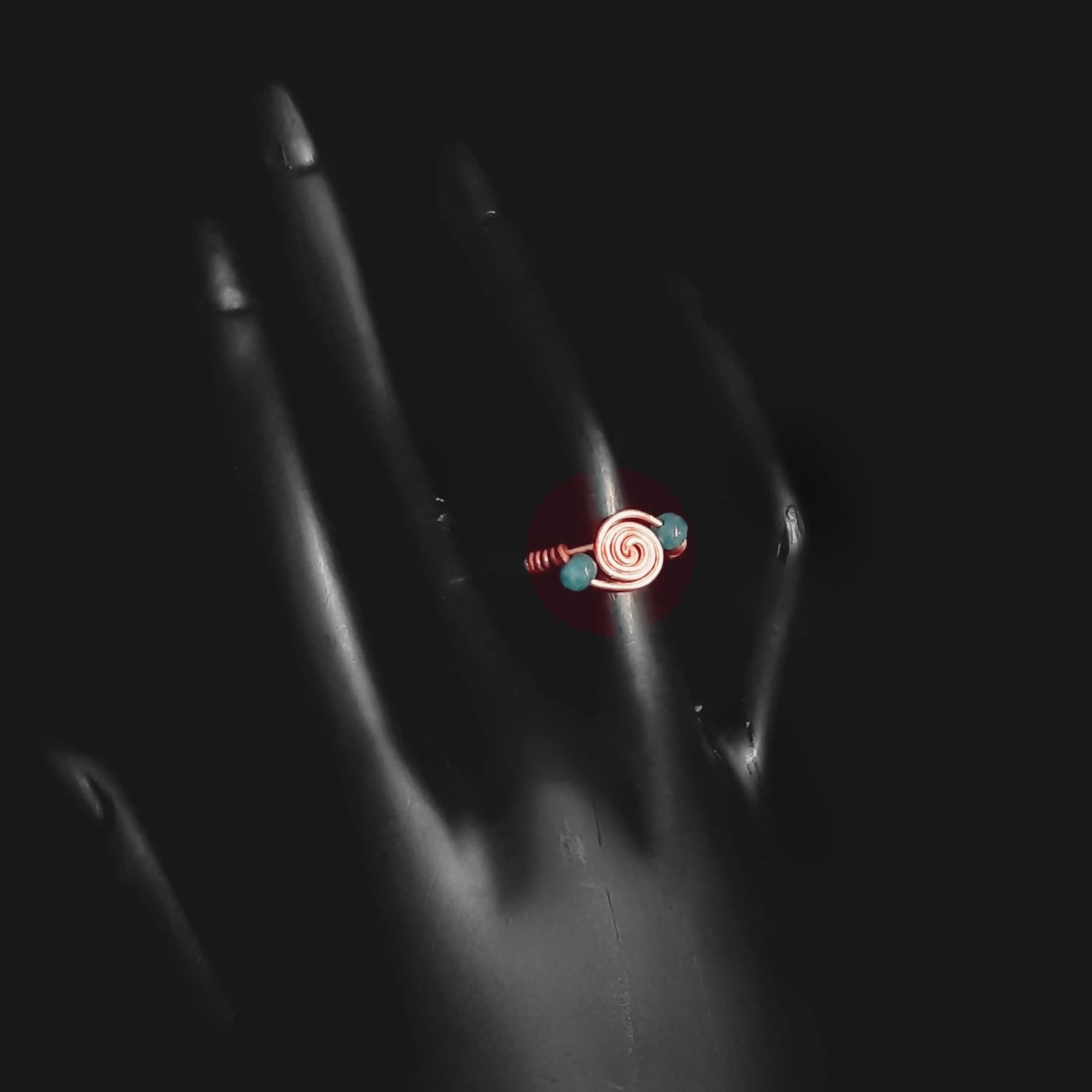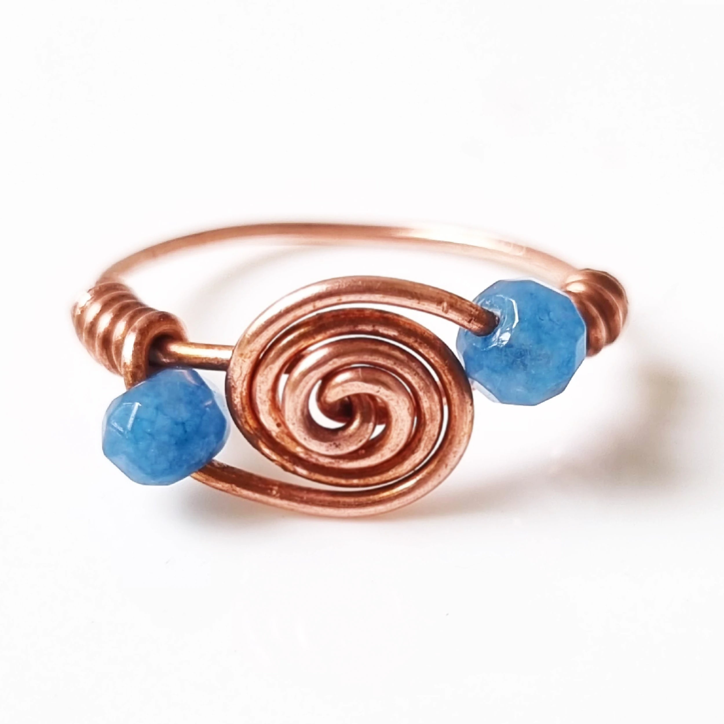 Let happy thoughts spin around you just as these blue crystal beads orbit this coiling copper ring.