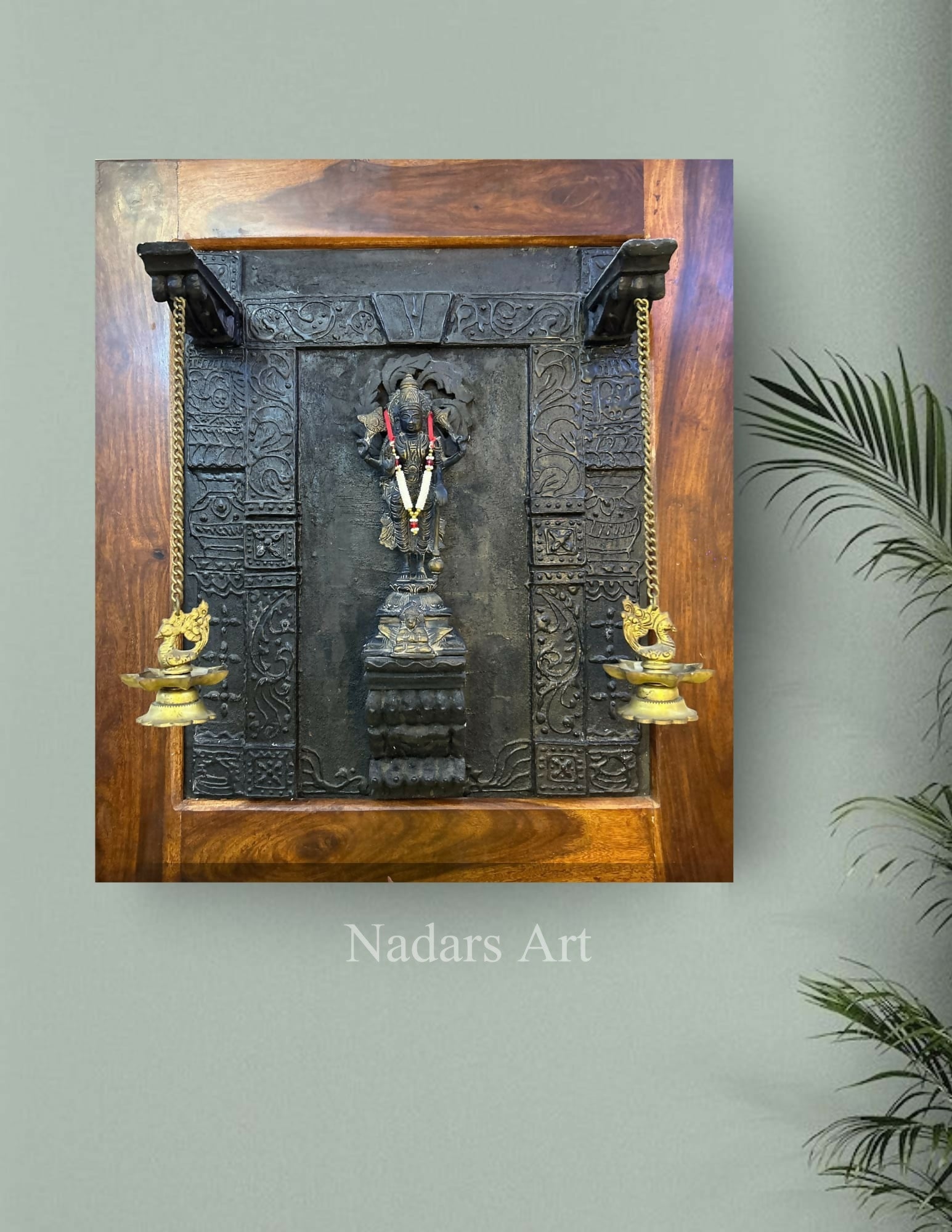 This artwork beautifully depicts Lord Vishnu in a traditional shrine setting, adorned with intricate carvings and brass lamps. It radiates divinity, serenity, and devotion, creating a sacred aura of spiritual grace.
