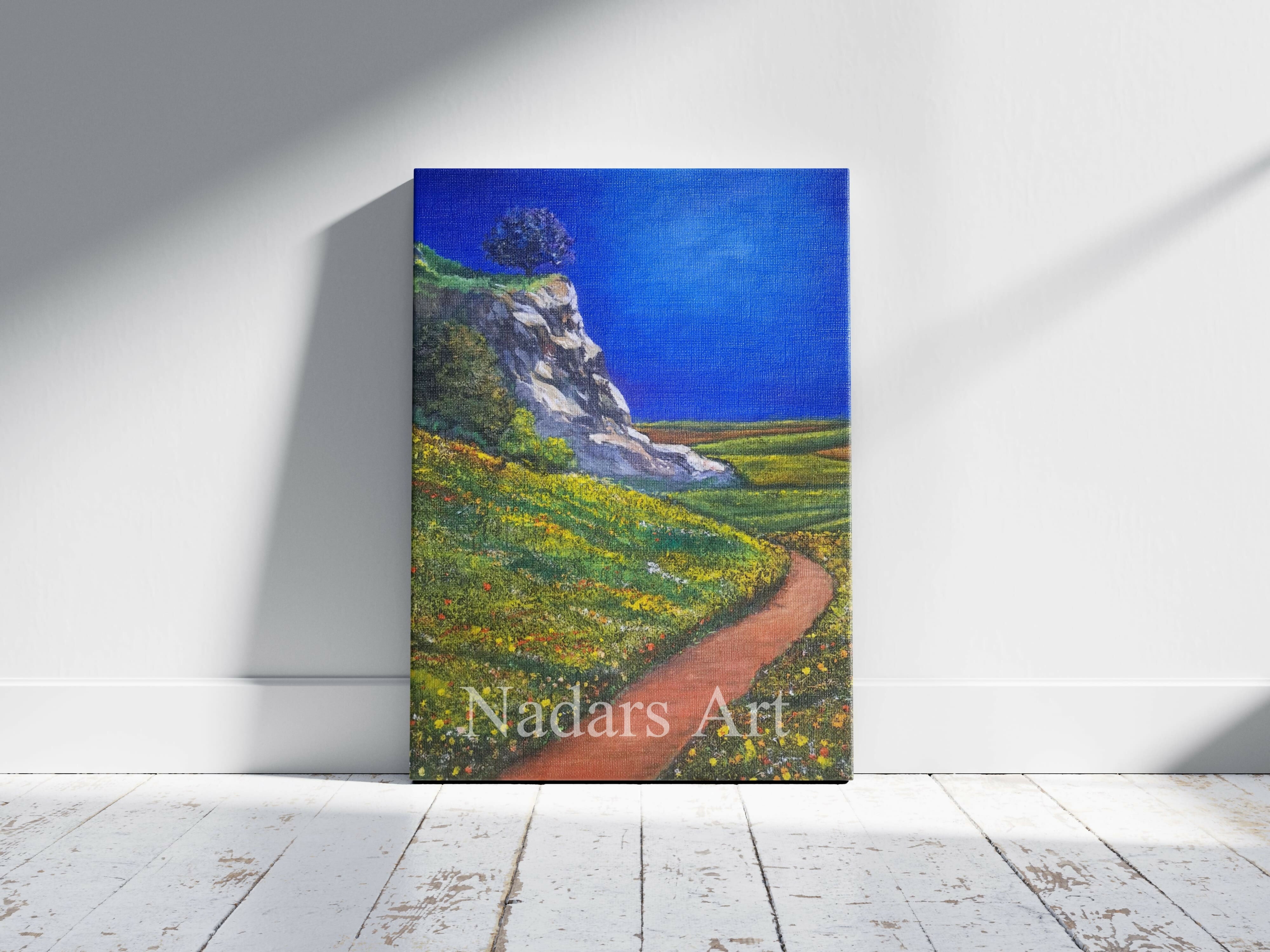 A vibrant landscape painting on easel featuring a winding path through green fields, leading to a hilltop tree against deep blue sky. Created by Nadars Art.