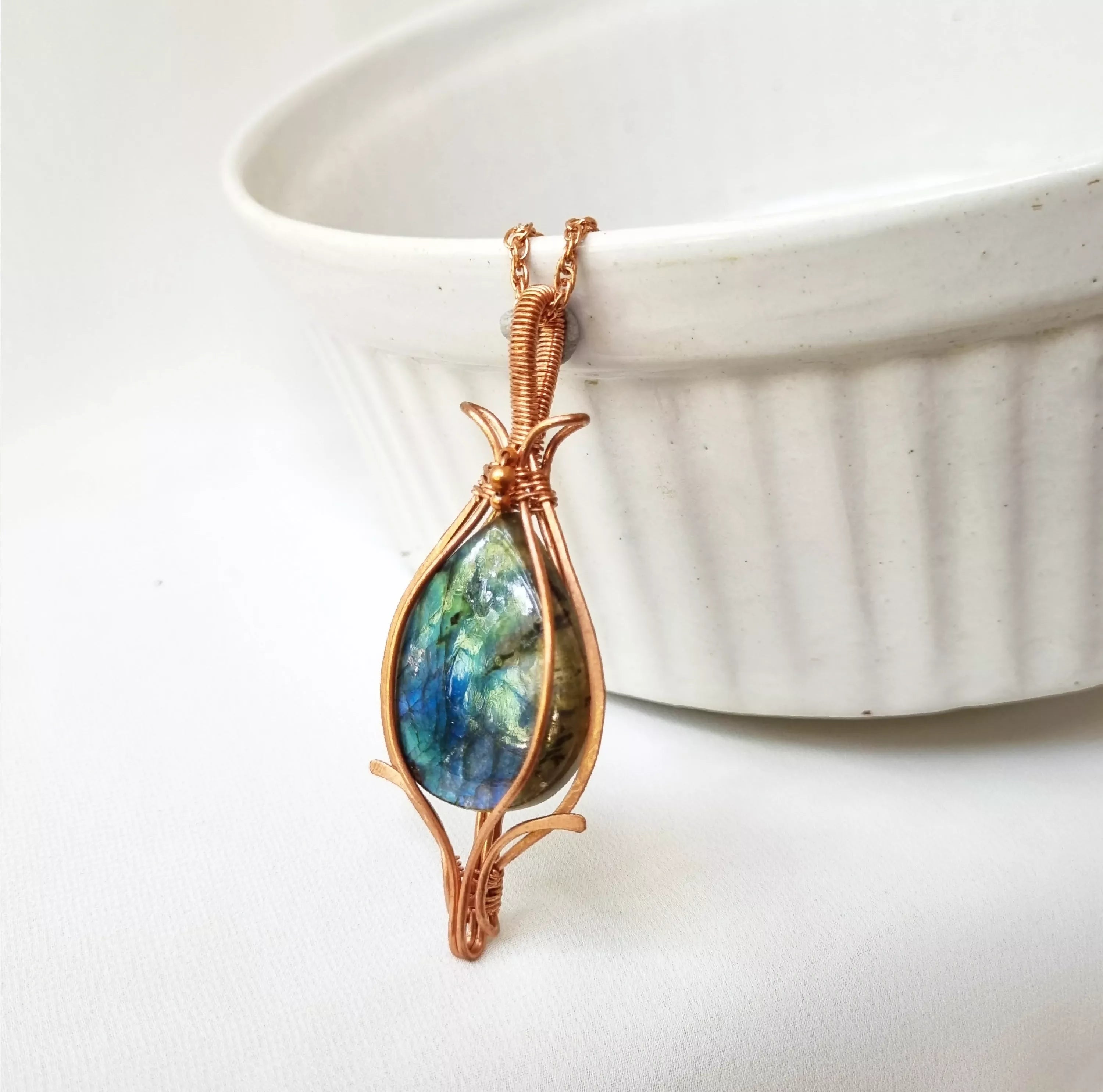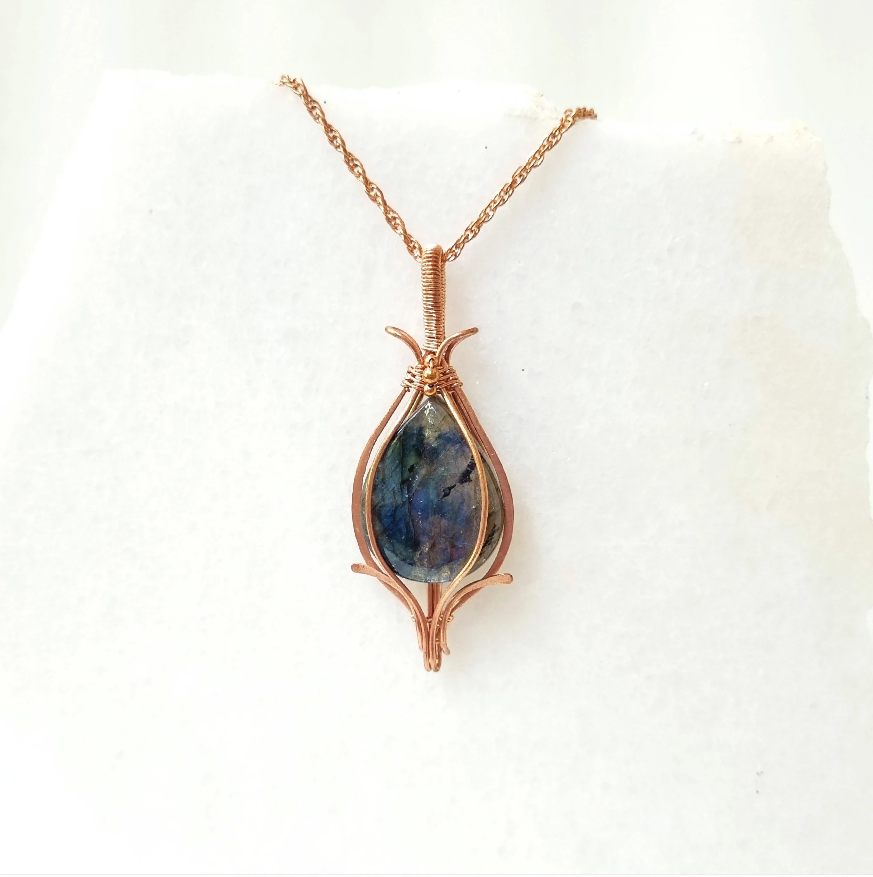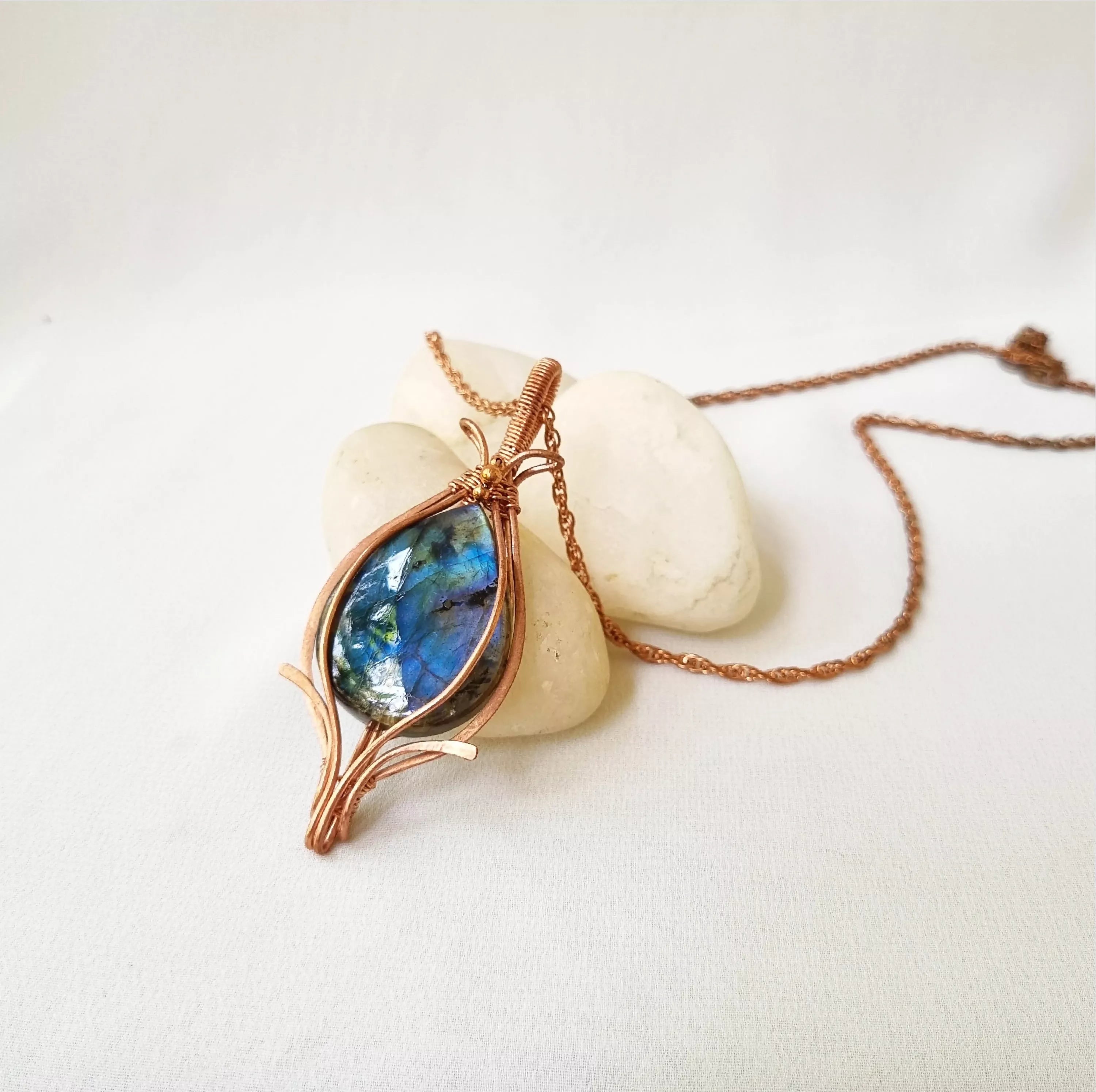 This gorgeous Labradorite and Copper pendant is good for the respiratory and digestive systems. Labradorite is a soothing gemstone that clears anxiety. It enhances artistic ambition and helps connect with cosmic energy.