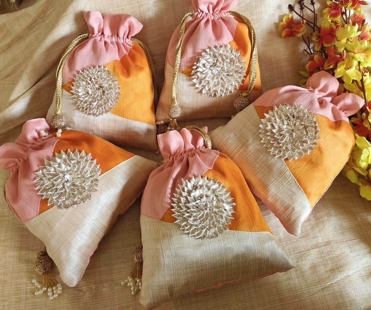 Each handcrafted, hand-embroidered potli is a masterpiece of traditional artistry, featuring intricate zardosi leaf work, shimmering sequin lattices, and elegant pearl-beaded handles. These luxurious accessories combine vibrant silks with exquisite detailing, perfect for festive celebrations and heritage gifting.