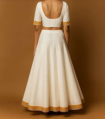 This is a white cotton lehenga set featuring a crop choli and a maxi skirt. The skirt's hem has vibrant arch panels with hand-painted camels, flowers, and sequins, creating an artistic, traditional, and festive look.