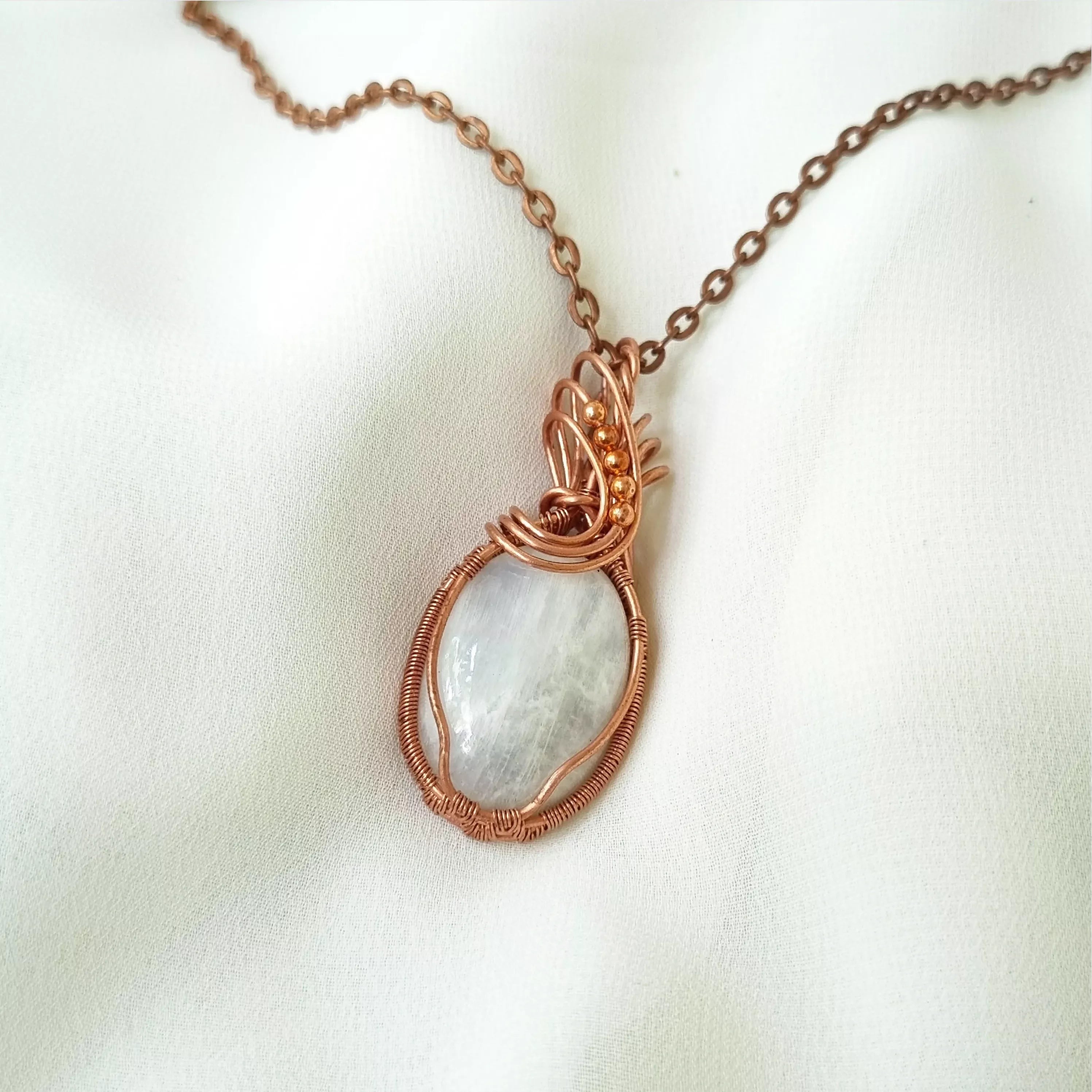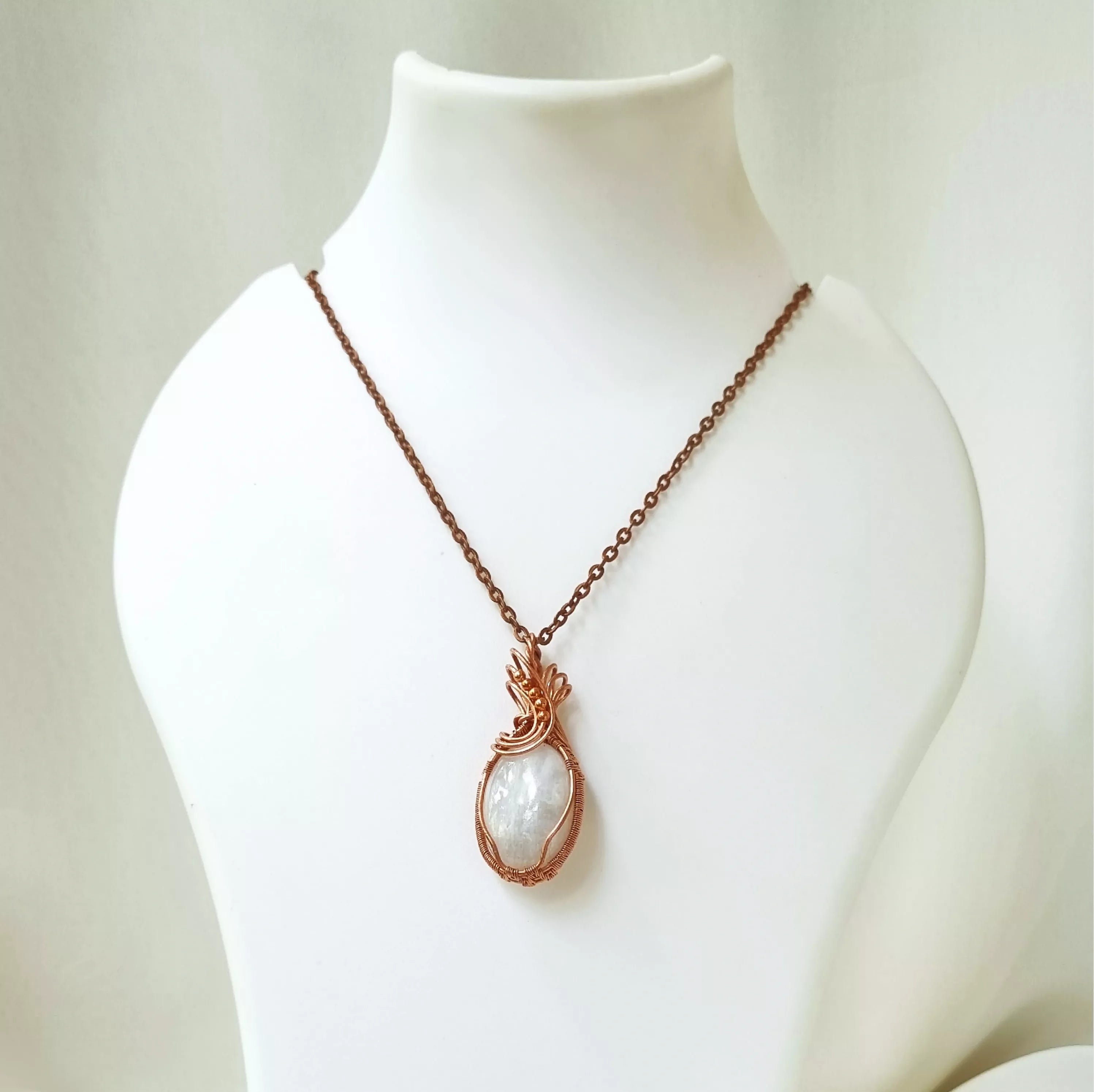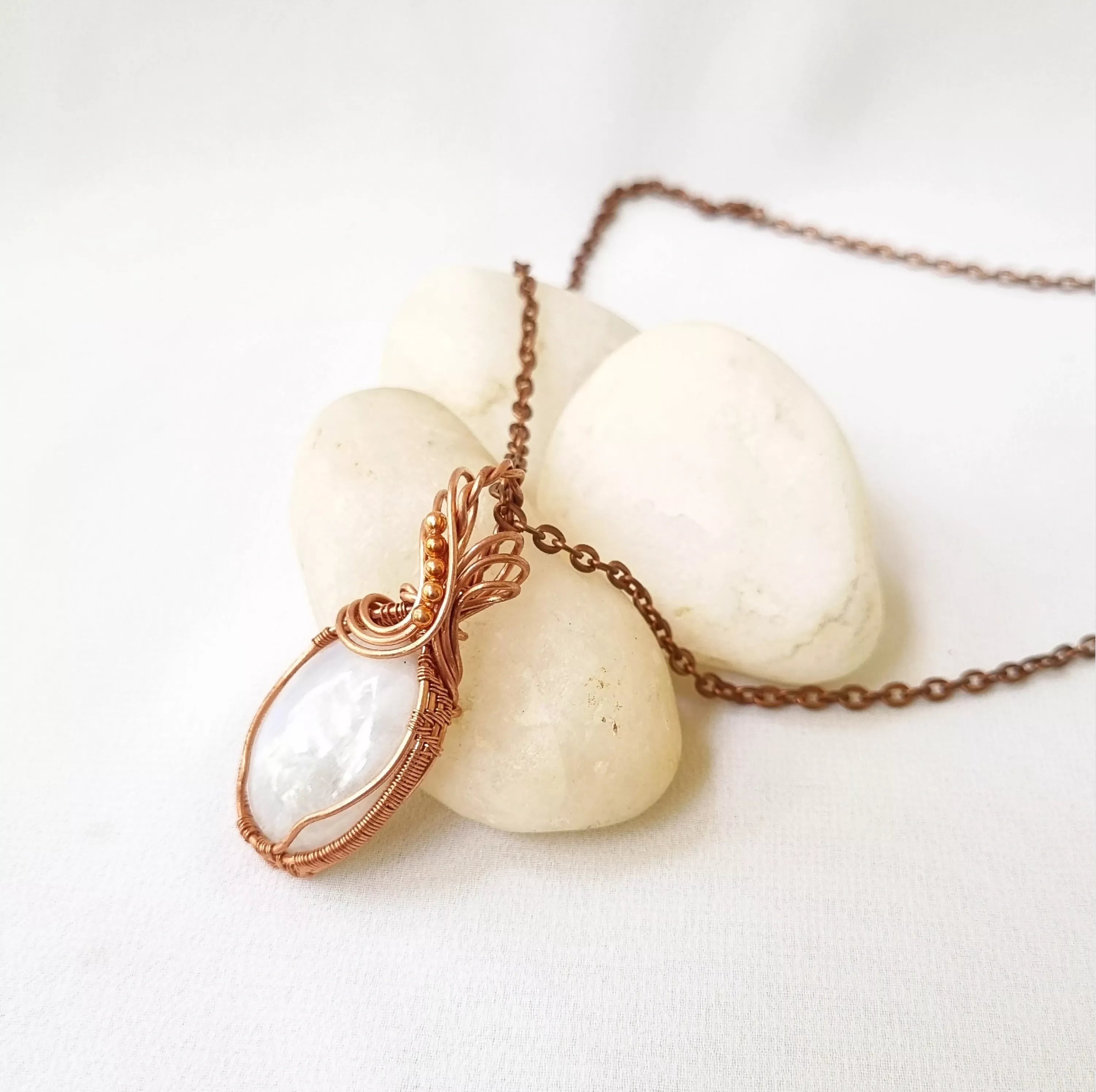 The healing energy of this gorgeous Moonstone and Copper necklace will help you connect with your emotions and your feminine energy. The tranquil energy of the moonstone invites creativity, restoration, and motherly protection.