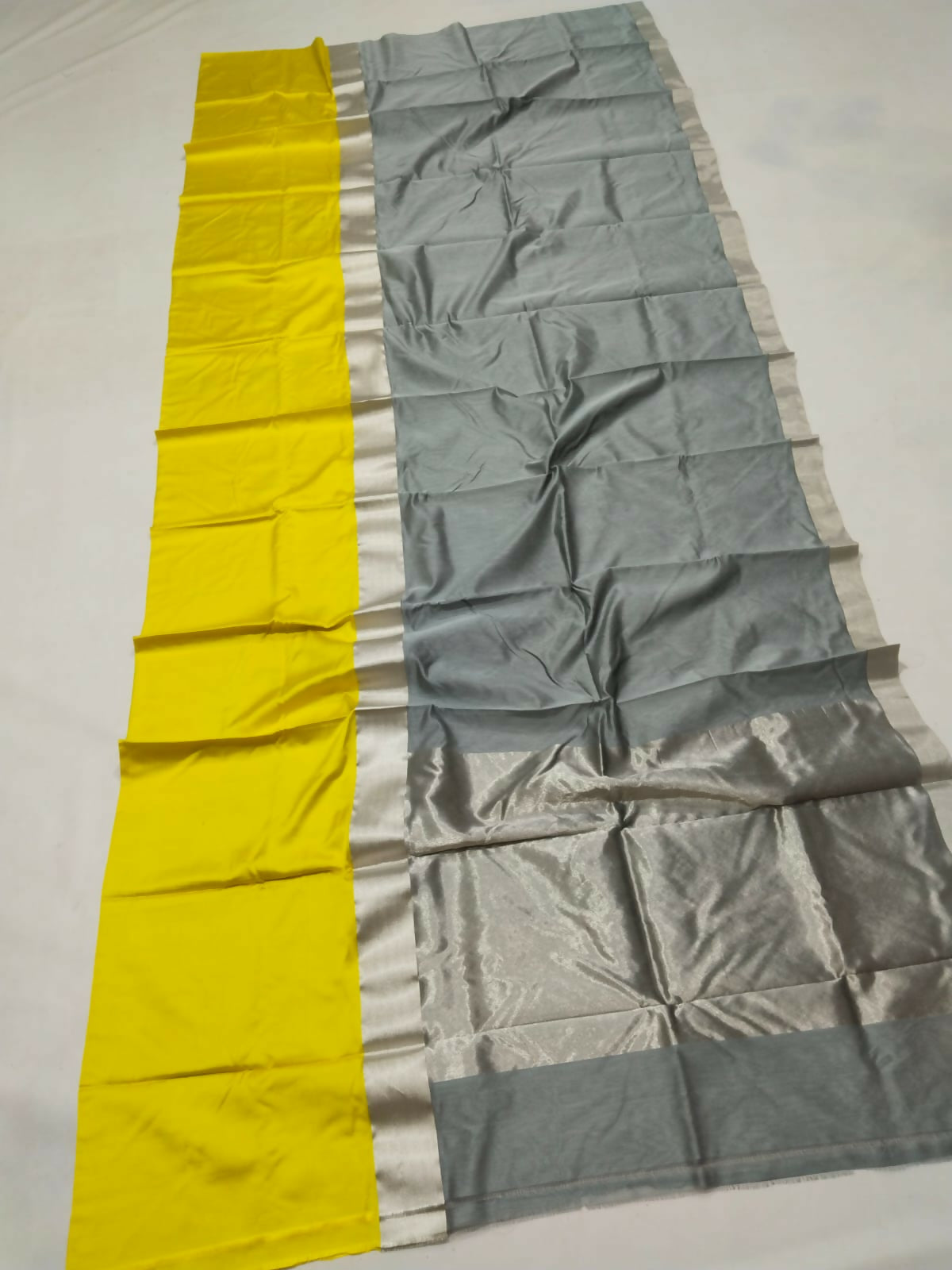 The image displays a sleek and contemporary Pattu Soft Silk Saree. It features a sophisticated Grey body, dramatically contrasted by a bold Bright Yellow end-panel. The entire piece is finished with a wide, high-lustre Metallic Silver Pallu segment, ensuring a luxurious and comfortable soft silk drape.