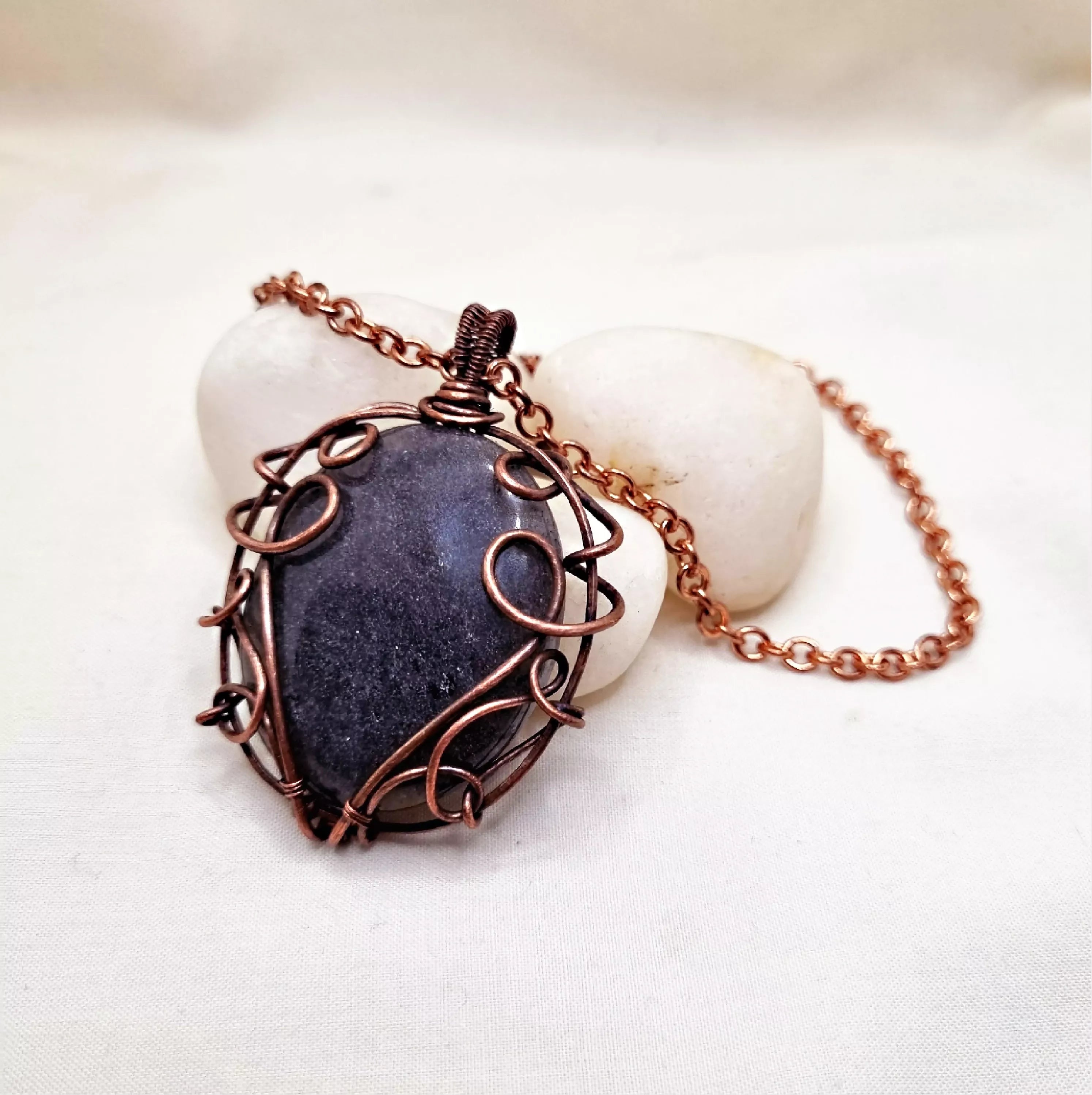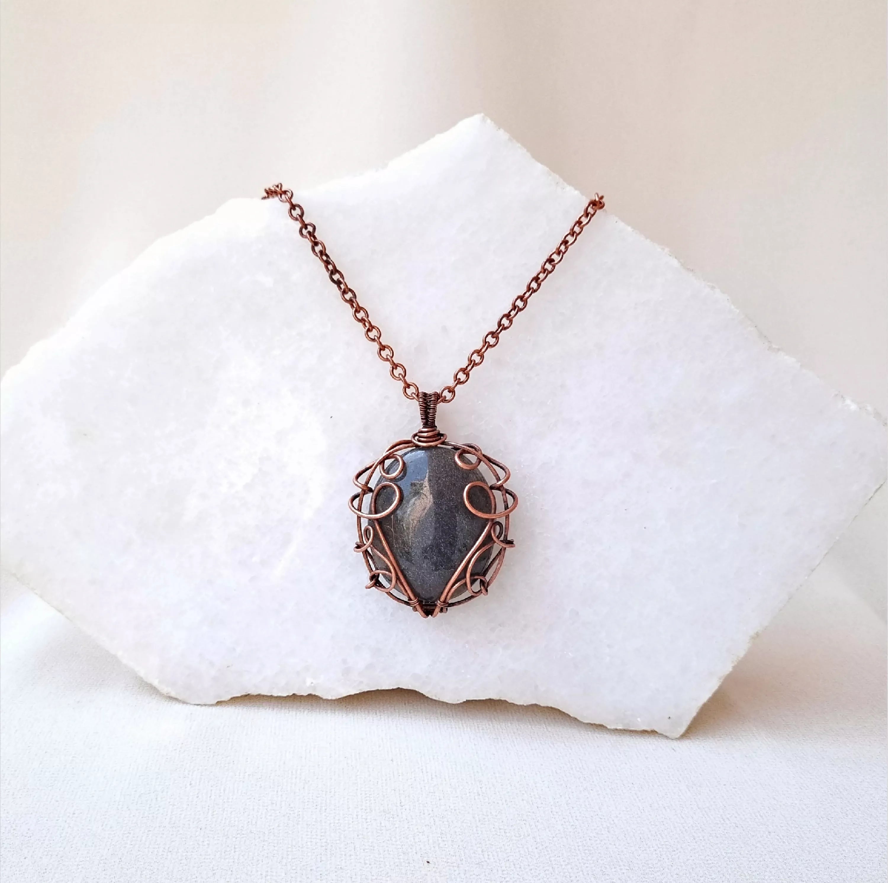 This handmade pendant has been crafted with dark grey onyx and copper wire. Feel the grounding and protective energy of onyx, while copper revitalizes and rejuvenates.