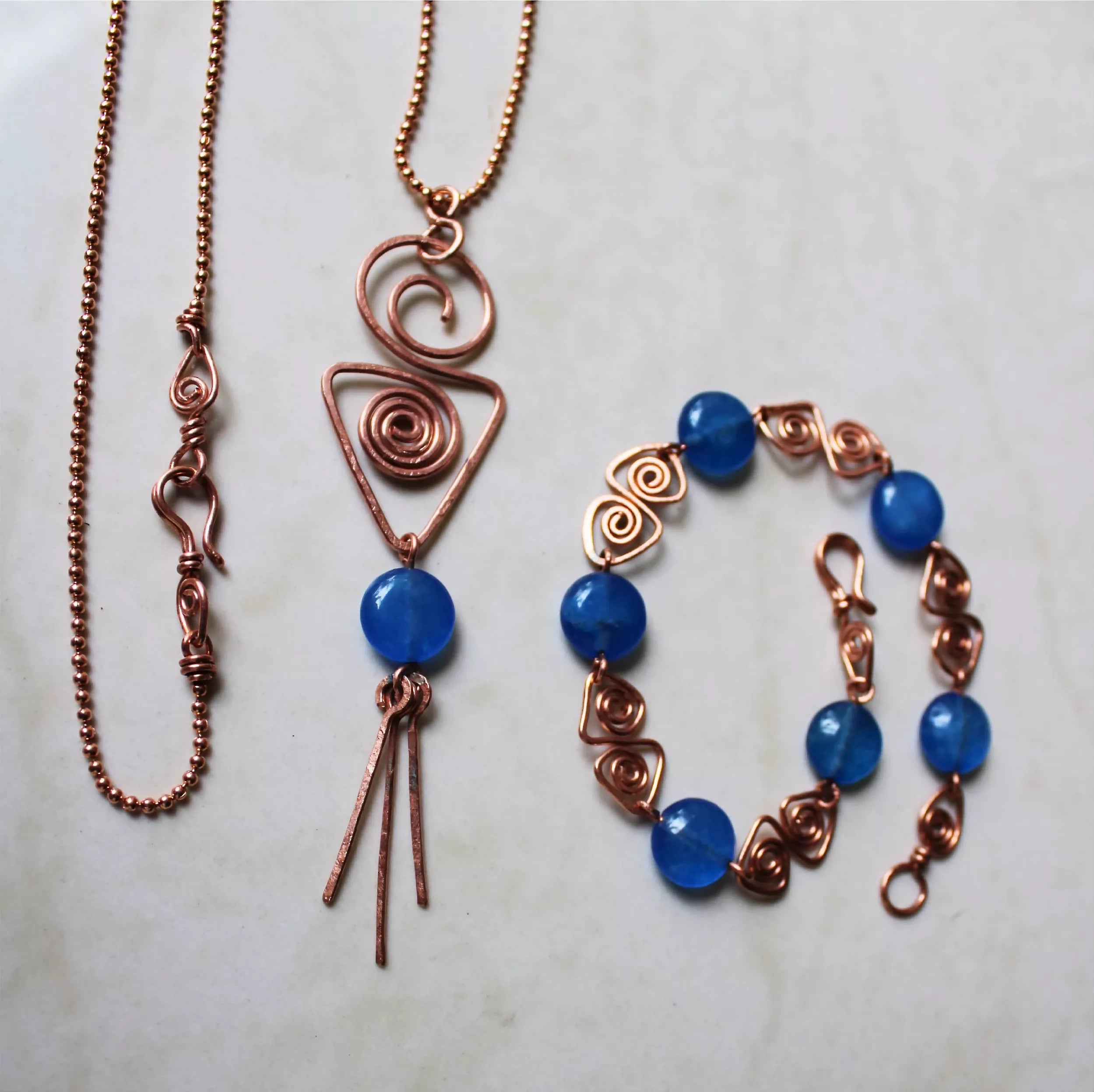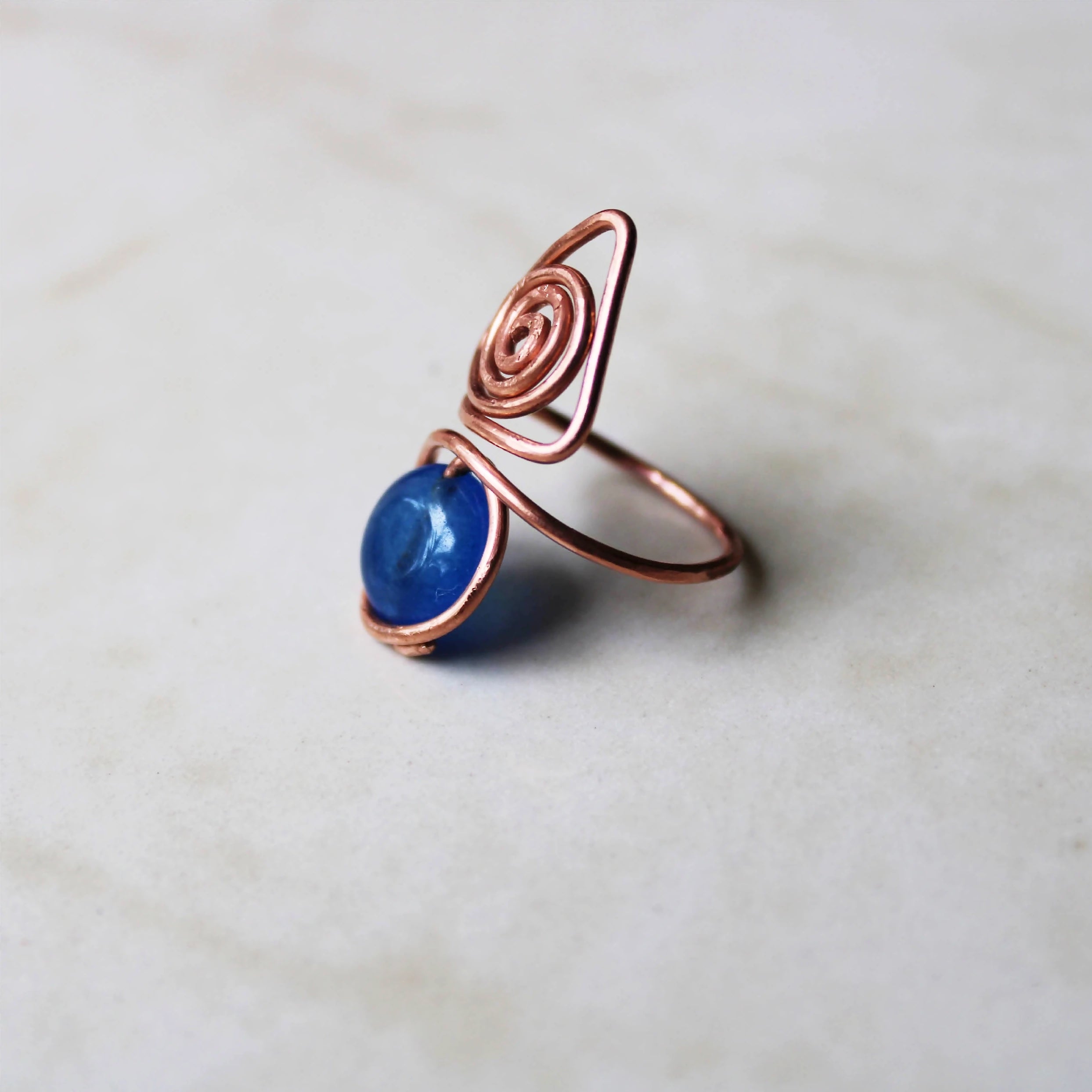 Spin through spiraling triangles of copper and mesmerizing blue agate. Blue Agate is associated with truth, loyalty and reliability.