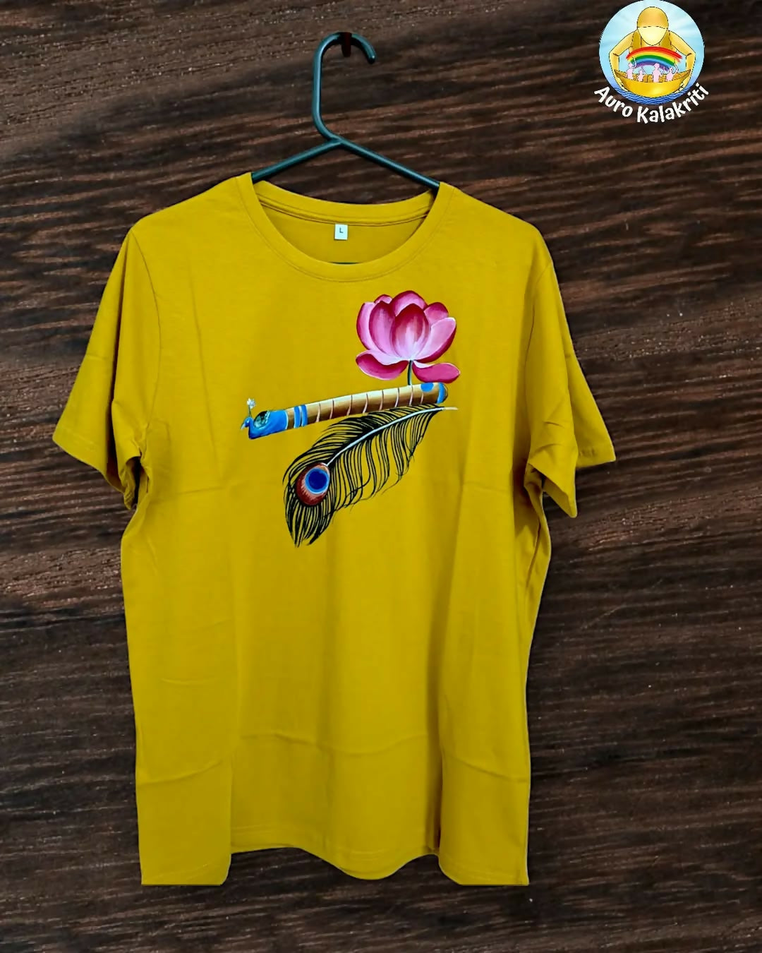 🎨 Divine Harmony in Every Stroke 💛 This hand-painted round neck T-shirt blends the sacred symbols of the lotus, flute, and peacock feather — representing purity, melody, and divine grace. Each design is lovingly painted by hand, making every piece a unique expression of devotion and artistry 🌸🪶🎶 ✨ 100% Cotton | Hand-painted | Made with Love Wear the art. Feel the presence. 🌿