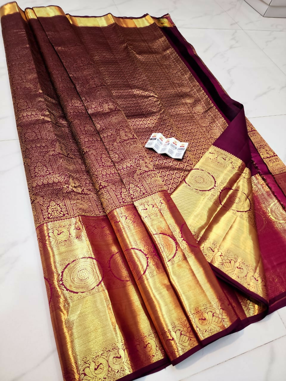 TheseĀ are Pure Handloom Kanchi Pattu Sarees from Kanchi Maharani Handlooms, Kanchipuram, meticulously woven with 1 gram gold zari. They feature fully handmade intricate designs, embodying traditional South Indian craftsmanship and luxury.