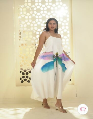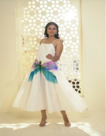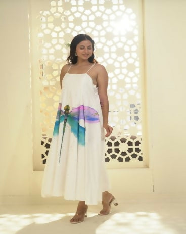 A breezy, white cotton maxi dress with spaghetti straps and a flared silhouette, featuring a large, vibrant hand-painted dragonfly motif in shades of blue, green, and magenta on the skirt