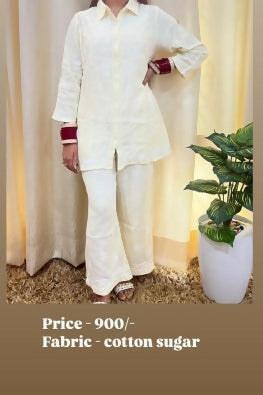 This is a two-piece suit set featuring a short shirt-style kurti and flared palazzo pants, both in an off-white or cream (ecru) color. The entire set is detailed with white thread-on-white Chikankari-style embroidery, particularly on the yoke, collar, and pant hems. The kurti has a shirt collar and a button-down placket, giving it a modern-traditional look. The fabric is described as "cotton sugar", suggesting a light, soft cotton blend.