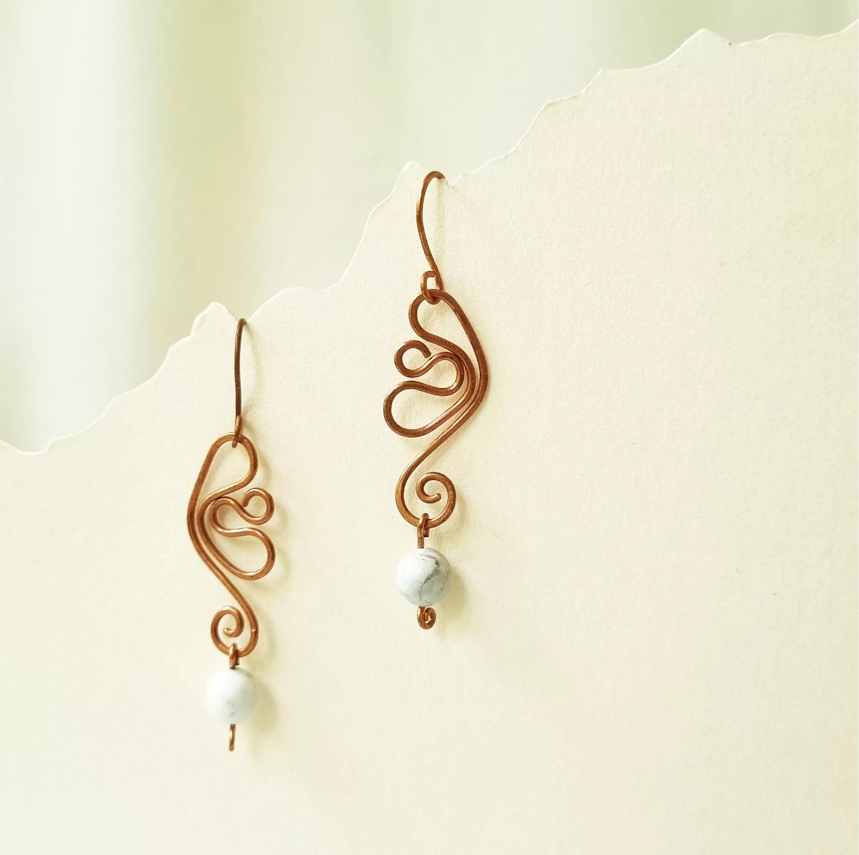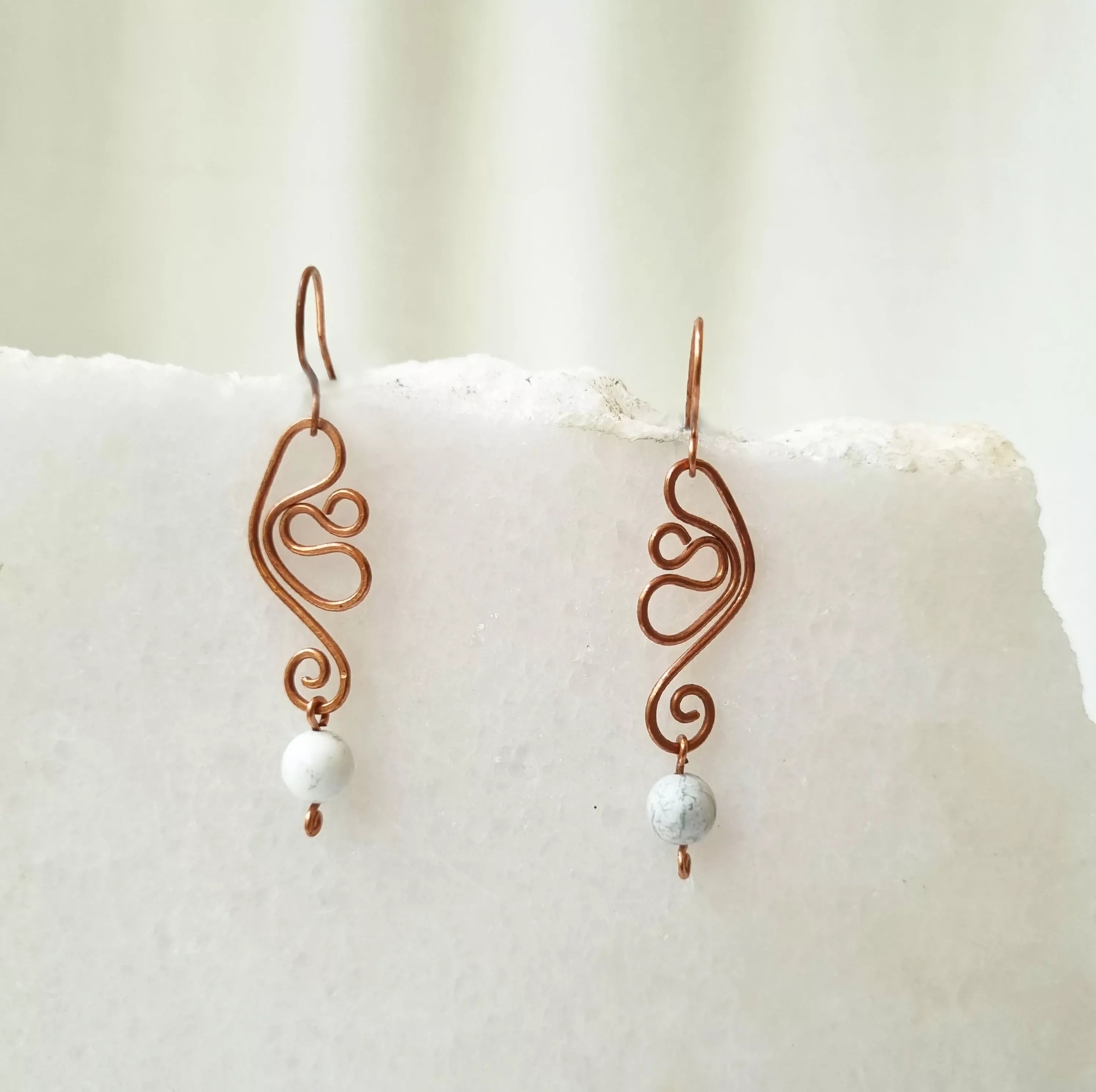 May this pair of handcrafted Copper and Howlite earrings bring you confidence and strength on you path to abundance. Howlite increases patience and helps to eliminate rage, pain and stress. A calming stone, This beautiful gemstone calms communication, facilitates awareness and encourages emotional expression.
